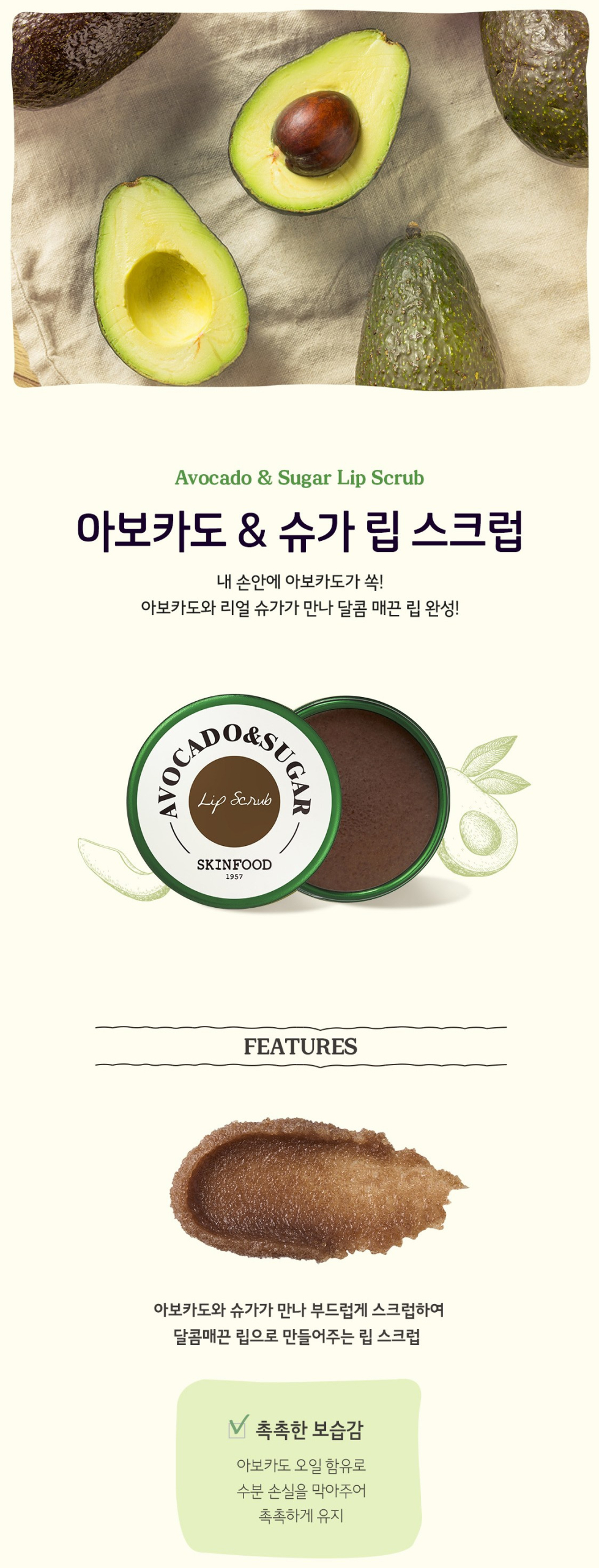 Avocado’nt forget about the lips! Get smooth and baby soft lips with the Skinfood Avocado & Sugar Lip Scrub, which contains exfoliating sugar to buff away dead flaky skin and nourishing shea butter and avocado oil to moisturise the lips.