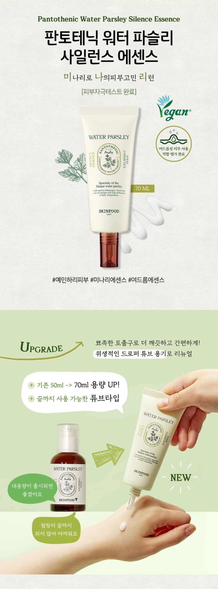This essence features pantothenic acid (Vitamin B5) and water parsley extract, using SKINFOODs unique whole-squeeze extraction method to maximize the benefits of water parsley from stem to leaf.
