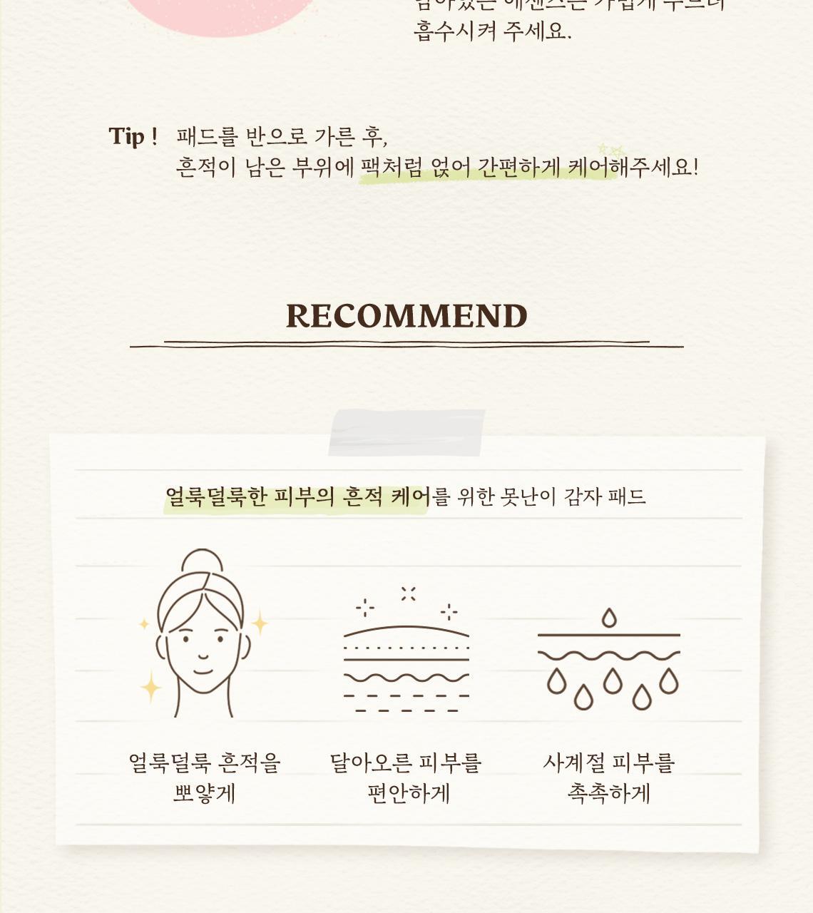 • Intensive Soothing & Brightening: The soothing potato pads work diligently to diminish and calm skin scars on uneven skin, supported by a clinical trial focused on scar removal and soothing effects.