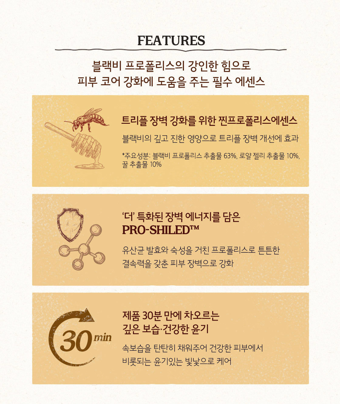 An essential essence that helps strengthen the skin core with the strong power of Black Bee Propolis.