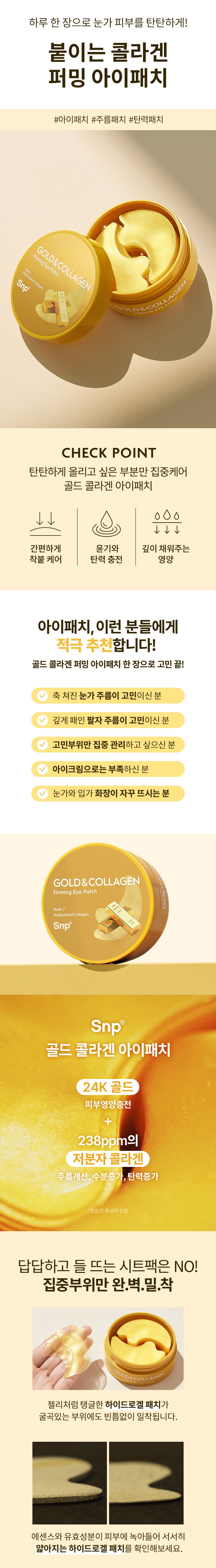The SNP Gold & Collagen Firming Eye Patch contains 3ppm Gold and 11,900ppm Hydrolyzed Collagen to help lift and firm the appearance of the delicate eye area, perfect for reducing wrinkles, puffy eyes, and dark under-circles! Hydrolyzed Collagen helps reduce wrinkles, improves skin elasticity and hydration, while 24K Gold promotes skin rejuvenation and elasticity for a more youthful-looking eye area. The specially-cut hydrogel sheet perfectly adheres to the skin without lifting or falling off curved areas of your face.