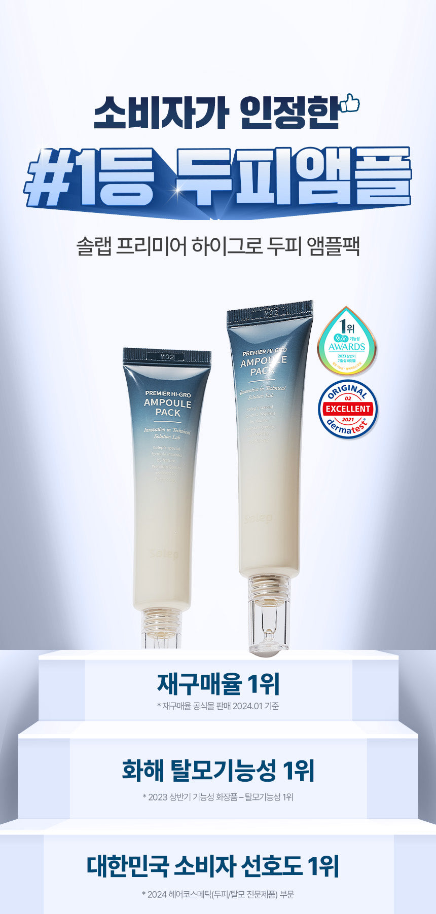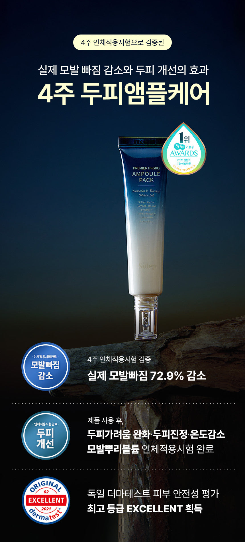 The Solep Premier Hi-Gro Ampoule Pack has successfully completed clinical trials, demonstrating a 72.9% reduction in hair loss. Recommended by a hair loss expert with over 20 years of experience, this product is crafted by a global brand renowned for its expertise in scalp and anti-hair loss care, operating 81 specialized centers worldwide.