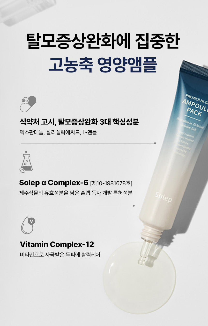 Experience a quick, 1-minute intensive scalp care treatment before going to sleep with the Solep Premier Hi-Gro Ampoule Pack, designed to address hair loss and improve scalp health.