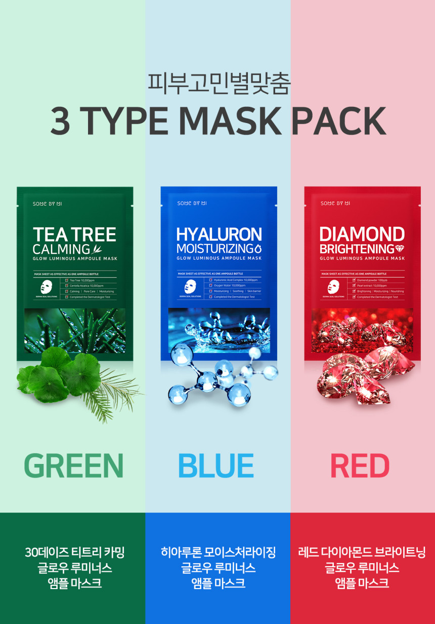 Tea Tree Calming Glow Luminous Ampoule Mask (Green): Purified Water, Glycerin, Glycereth-26, Tea Tree Leaf Extract (10,000ppm), Centipede Extract, Pot Marigold Flower Extract, Green Tea Extract, Mugwort Extract, White Willow Bark Extract, Oregano Leaf Extract, Lactobacillus / Soybean Fermentation Extract, Brook Bark Extract, Golden Extract, Pepper Extract, Pentyleneglycol, Sodium Hyaluronate, Sodium Hyaluronate Crosspolymer, Hydrolized Hyaluronic Acid, Hyaluronic Acid Hexanediol, Butyleneglycol, Polyglyceryl 10 Laurate, Polyglyceryl-10 Myristate, Arginine, Carbomer, Xanthan Gum, Xanthan Gum, Hydroxyethylcellulose, Panthenol, Dipotassium Glycyrrhizate, Disodium Iodide, Hexylene Glycol, Hydroxyacetophenone, Ethylhexyl Glycerin, Bergamot Oil.