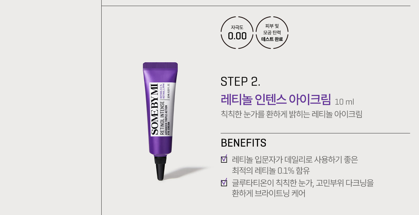 [Some By Mi Retinol Eye Cream]: Water, Glycerin, Caprylic/Capric Triglyceride, Dimethicone, Polysorbate 60, Niacinamide, Methylpropanediol, Cetyl Alcohol, Polymethylsilsesquioxane, Centella Asiatica Extract, Dioscorea Japonica Root Extract, Piper Methysticum Leaf/Root/Stem Extract, Melaleuca Alternifolia (Tea Tree) Leaf Extract, Panax Ginseng Berry Extract, Artemisia Capillaris Extract, Ganoderma Lucidum (Mushroom) Stem Extract, Chlorella Vulgaris Extract, Glycine Soja (Soybean) Seed Extract, Nymphaea Alba Flower Extract, Elaeis Guineensis (Palm) Oil, Hydrogenated Lecithin, Sodium Hyaluronate, 1,2-Hexanediol, Dimethicone/Vinyl Dimethicone Crosspolymer, Panthenol, BHT, Cyclopentasiloxane, Steareth-21, PEG-10 Dimethicone/Vinyl Dimethicone Crosspolymer, Polyacrylamide, Steareth-2, Isohexadecane, Carbomer, Hydroxyacetophenone, C13-14 Isoparaffin, Tromethamine, Palmitic Acid, Polyquaternium-51, Stearic Acid, Polysorbate 20, Retinol(0.1%), Ethylhexylglycerin, Glyceryl Caprylate, Tocopheryl Acetate, Polyglyceryl-10 Myristate, PEG-30 Dipolyhydroxystearate, Hydroxyethylcellulose, Glycosyl Trehalose, Beta-Glucan, Glyceryl Polymethacrylate, Laureth-7, Butylene Glycol, Disodium EDTA, Hydrogenated Starch Hydrolysate, Adenosine, Raffinose, Dipotassium Glycyrrhizate, Lecithin, Tocopherol, Pentylene Glycol, BHA, Myristic Acid, Tranexamic Acid, Propanediol, Dipropylene Glycol, Disodium Phosphate, Caprylyl Glycol, Collagen, Madecassic Acid, Biosaccharide Gum-1, Asiaticoside, Sodium Palmitoyl Proline, Leuconostoc/Radish Root Ferment Filtrate, Asiatic Acid, Glutathione, Retinal, Madecassoside, Sodium Phosphate, Ferulic Acid, Acetyl Hexapeptide-8, Ammonium Acryloyldimethyltaurate/VP Copolymer, Tetrahydropiperine, Phloretin, Arginine, Fragrance