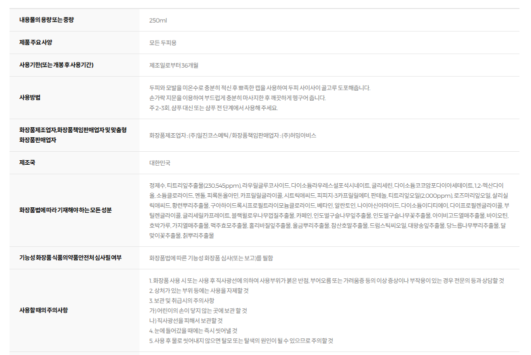 - Panthenol, Niacinamide, Salicylic Acid: Functional ingredients recognized by the Ministry of Food and Drug Safety, helping to alleviate hair loss symptoms.