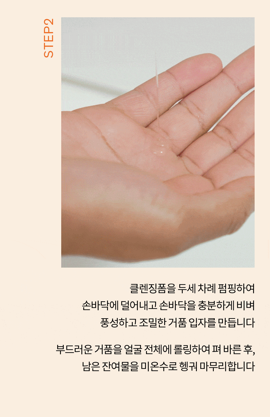Step 2: Pump the cleansing foam two to three times onto your palm and rub your hands together to create a dense and rich lather. Apply the soft foam all over your face with a rolling motion. Rinse off with lukewarm water to finish, leaving no residue behind.