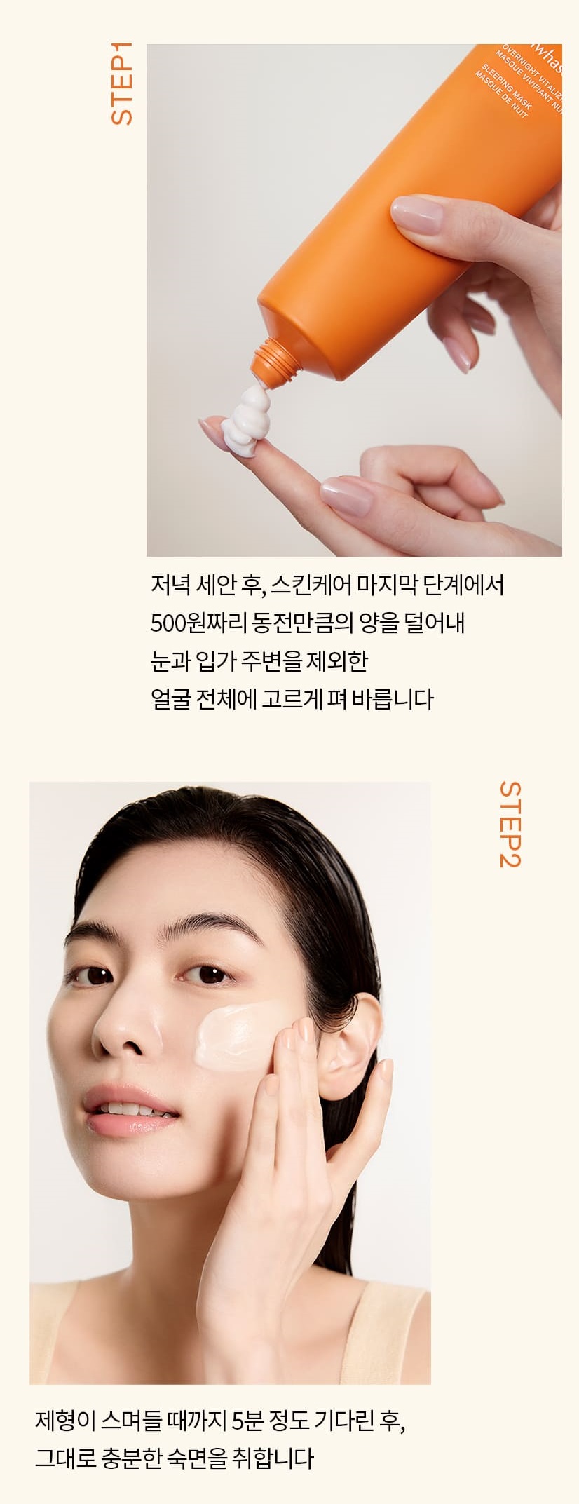 After evening cleansing and skincare routine, take a coin-sized amount (about the size of a 500 KRW coin) and gently apply over the entire face, avoiding the eye and lip areas.