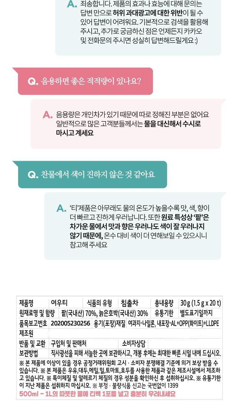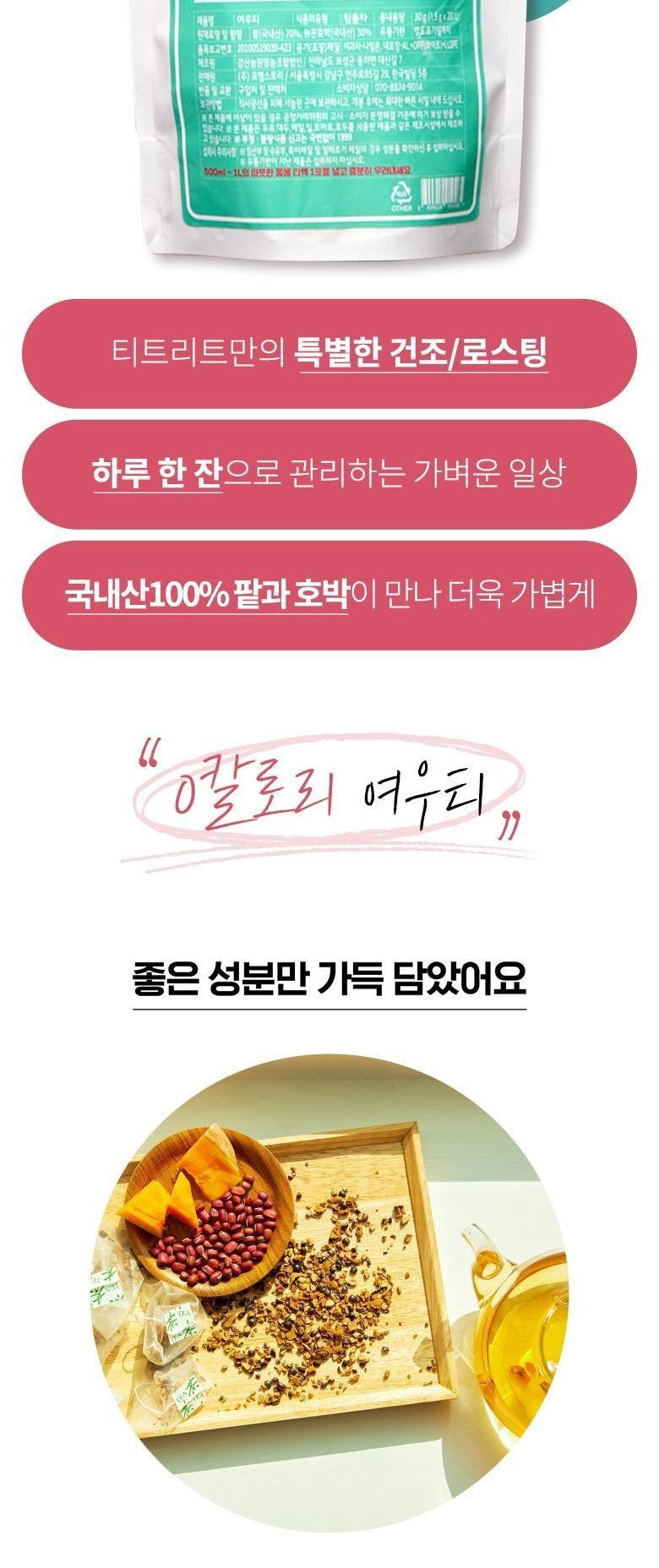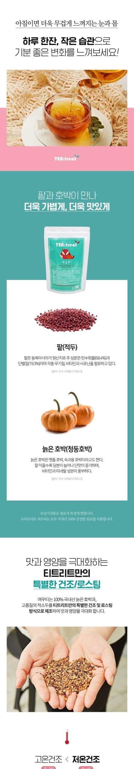 This specially crafted tea blend uses 100% domestically-sourced red beans and pumpkin, ensuring every sip is bursting with purity and flavor. The ingredients are: