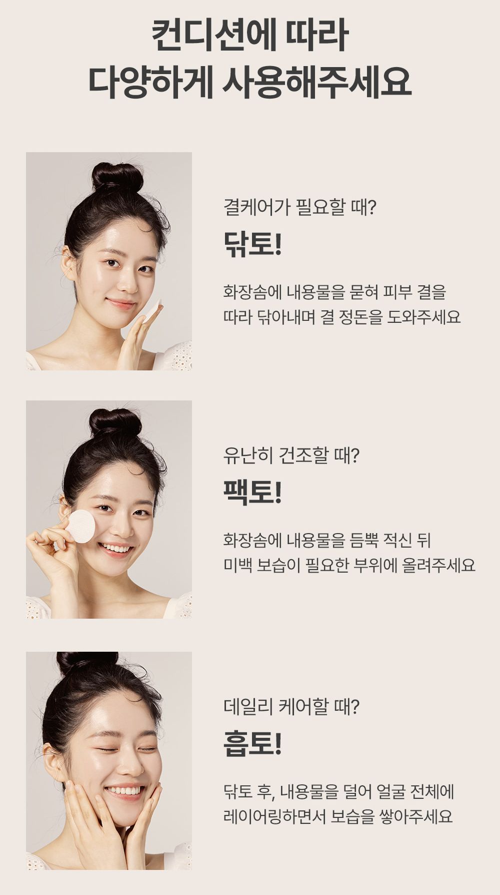 After cleansing, dispense an appropriate amount onto a cotton pad or hands. Gently pat or wipe across face, layering as needed for extra hydration. Can also be used as a toner pack by soaking cotton pads and applying to areas needing extra care.