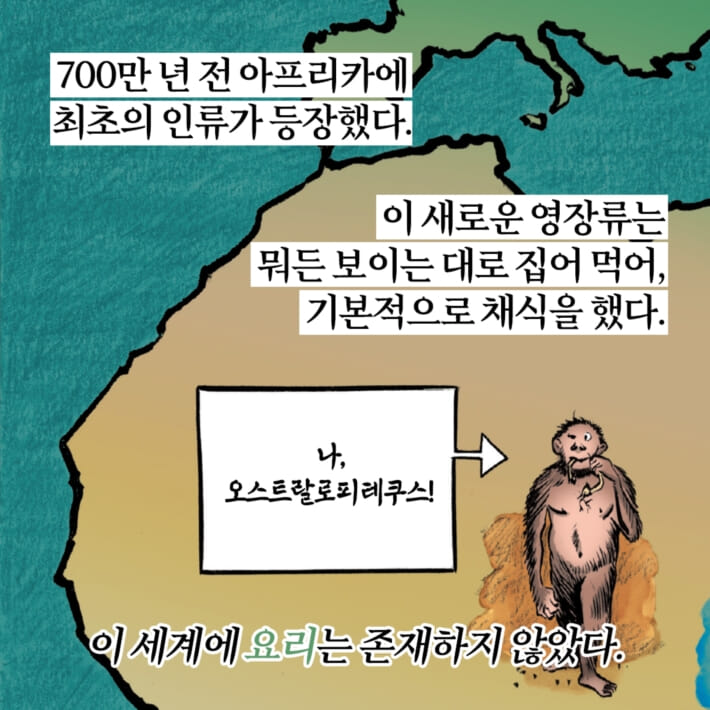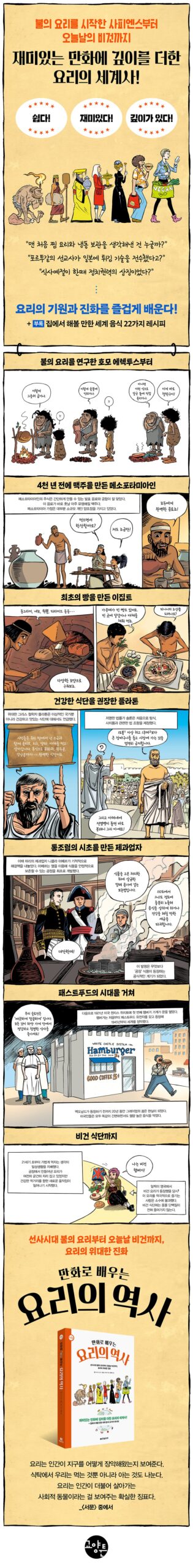 Once they were able to control fire, humans immediately started cooking. Isn’t it surprising that Sapiens have already devised steaming and freezing? The discovery of cooking began to change the world beyond the way we eat. What kind of consciousness is contained in the ‘light and healthy food’ that is on our table today? 〈Hanbit Biz Literature Toon〉, which continues to expand the ‘History Reading by Subject’ series with keywords such as wine, medicine, animals, and immortality, has published a new book. “The history of cooking learned through cartoons” is an educational cartoon that examines human history through the evolution of cooking. From Mesopotamia, where beer was first brewed 4,000 years ago, through fast food to vegan diets, the evolution of cooking and humans unfolds at the same time. As an appendix, ’22 recipes of world cuisine’ that appear in the history of cooking are also provided.