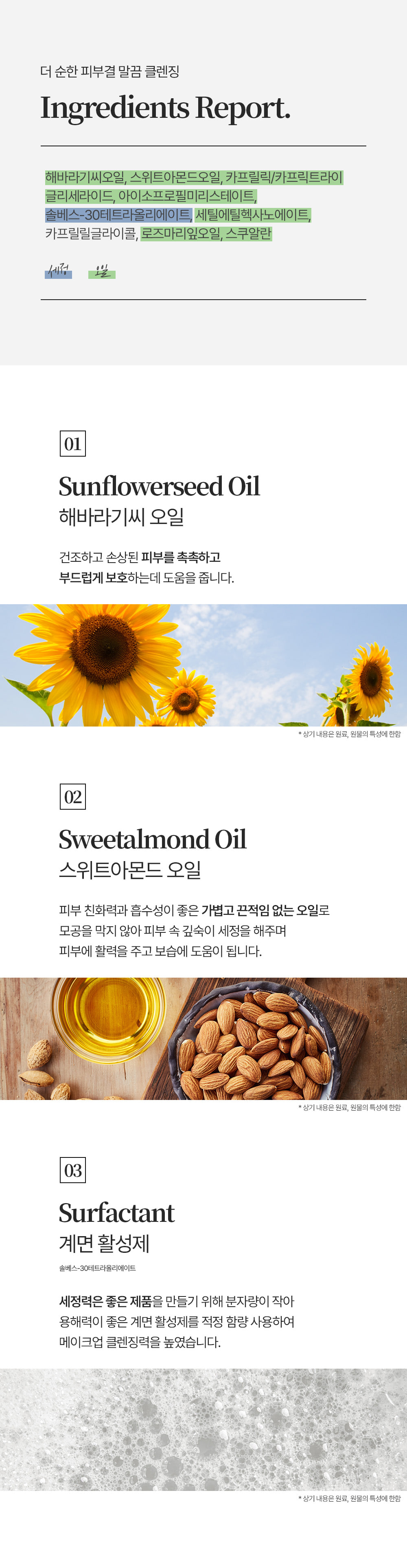 | 03. Surfactant (Caprylic/Capric Triglyceride, Polysorbate-30, Sorbitan Sesquioleate, etc.) | To create a product with excellent cleansing power and emulsifying properties, an appropriate amount of mild surfactants are used, enhancing makeup cleansing efficacy. |