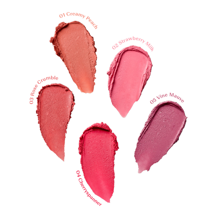 - 03 Rose Crumble: Dimethicone, Dicaprylyl Carbonate, Diisostearyl Malate, Synthetic Wax, Ethylhexyl Hydroxystearate, Polyglyceryl-2 Triisostearate, Microcrystalline Wax, Diglyceryl Sebacate/Isopalmitate, Silica, Vinyl Dimethicone/Methicone Silsesquioxane Crosspolymer, Dimethicone Crosspolymer, Candelilla Wax, Titanium Dioxide (CI 77891), Polyhydroxystearic Acid, Phenoxyethanol, Caprylic/Capric Triglyceride, Red Iron Oxide (CI 77491), Fragrance, Lecithin, Ethylhexyl Palmitate, Isostearic Acid, Isopropyl Myristate, Polyglyceryl-3 Polyricinoleate, Tocopheryl Acetate, Triethoxycaprylylsilane, Aluminum Hydroxide, Black Iron Oxide (CI 77499), Yellow Iron Oxide (CI 77492), Red No. 202 (CI 15850:1).