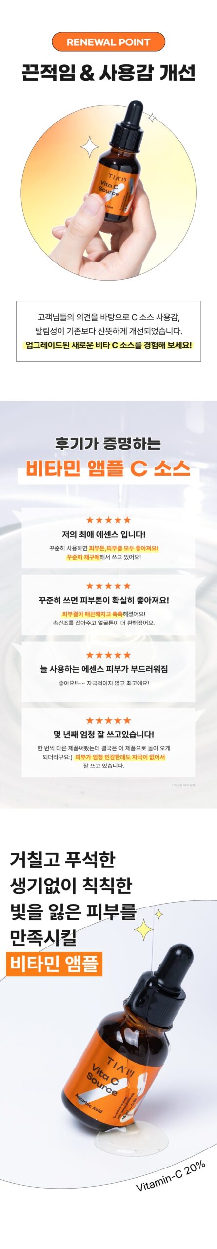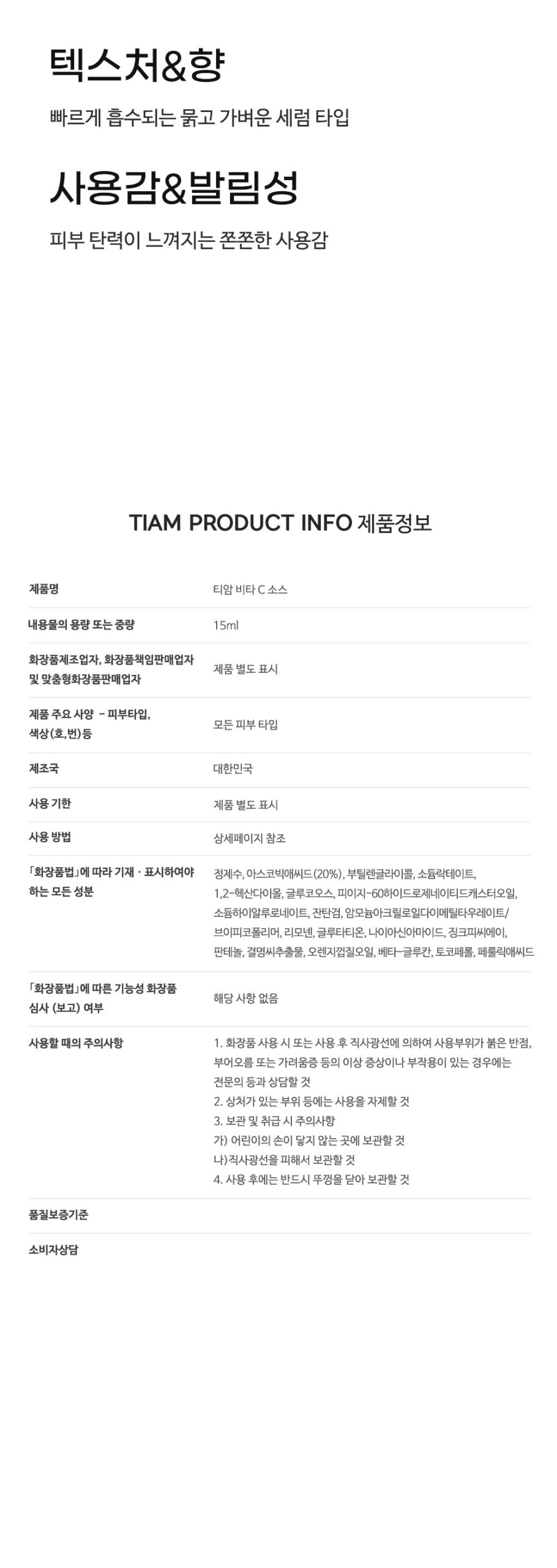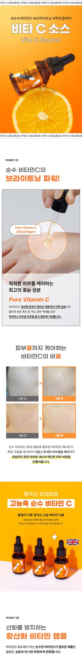 はじめてこのTIAM Vita C Sourceを使うとき、少し疑念がありました。他のビタミンC製品でも満足できなかったからです。でも、この15mlボトルに詰まった新しい感触には驚かされました。ベタつきを気にする方にも優しく、更に塗布後すぐ透明感を感じることができます。化粧水前や肌メイク直後としても非常によく効きますね!外出時の日差しへの抵抗力が確実に上昇しました。このスキンケアアイテムなくして、自信のある自分像は築けないですね。