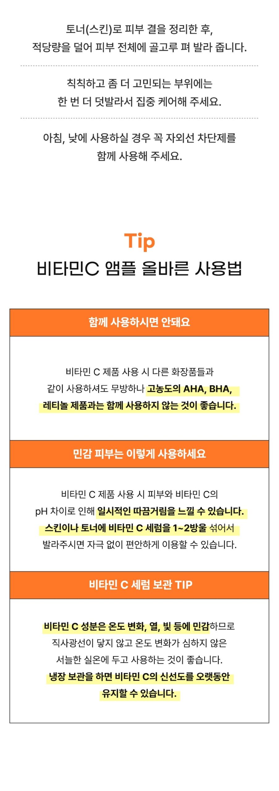 - In case of sensitive skin, temporary tingling may be felt due to the difference between vitamin C and skin pH. You can use it comfortably without irritation by mixing 1-2 drops of vitamin C serum with your toner or toner.