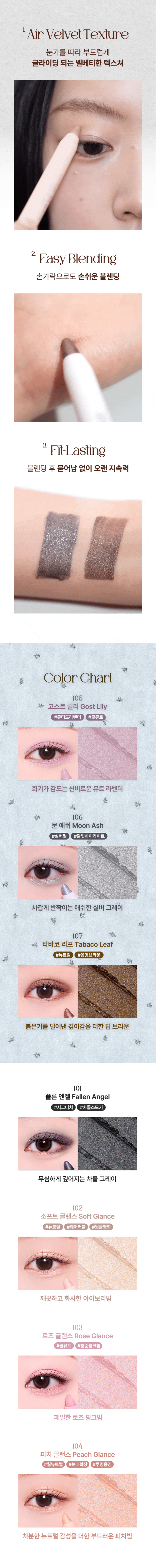 - 01 Airy Velvet Texture: Light as air, this shadow stick glides smoothly onto your eyelids, offering a soft touch that feels incredibly comfortable.