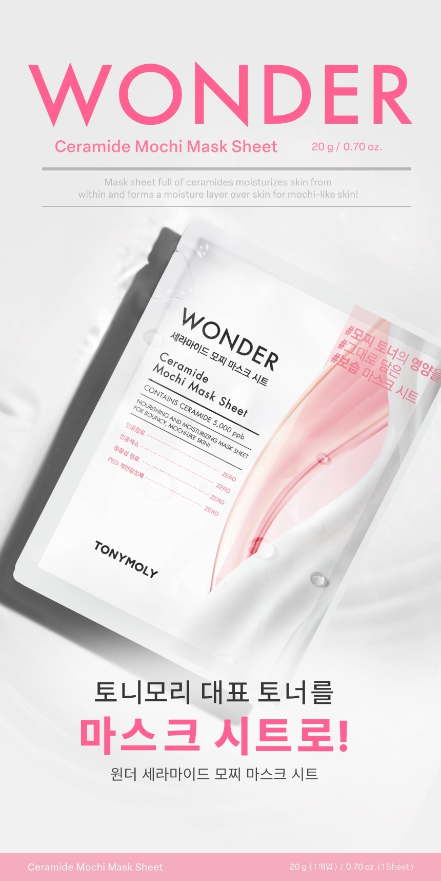 A moisturizing mask sheet that fills dry skin with hydration and nourishment using ceramide ingredients, leaving your skin soft and bouncy like mochi.