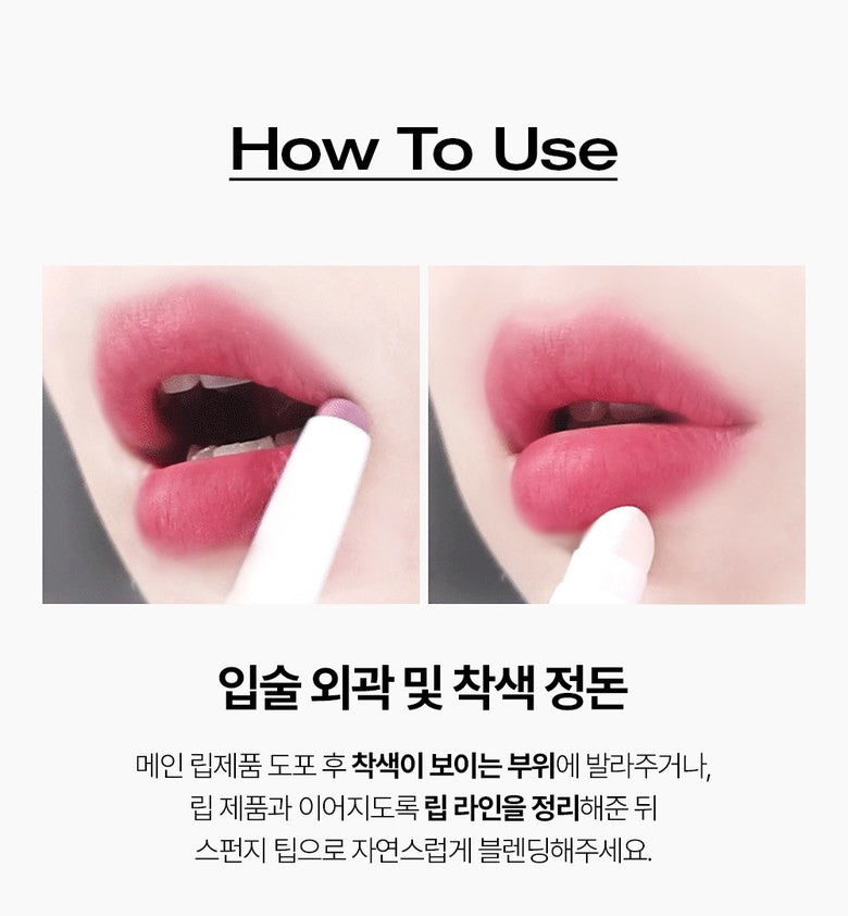 - Define and Blend: After applying your main lip product, use the color stick to define the outer edge of your lips or to cover any visible pigmentation. Blend naturally with the sponge tip for a smooth transition between the lip line and the main lip color.
