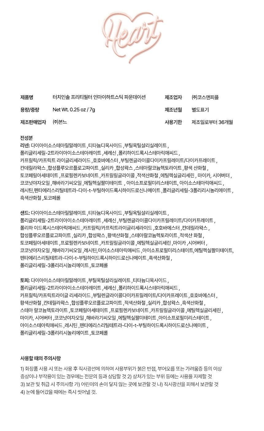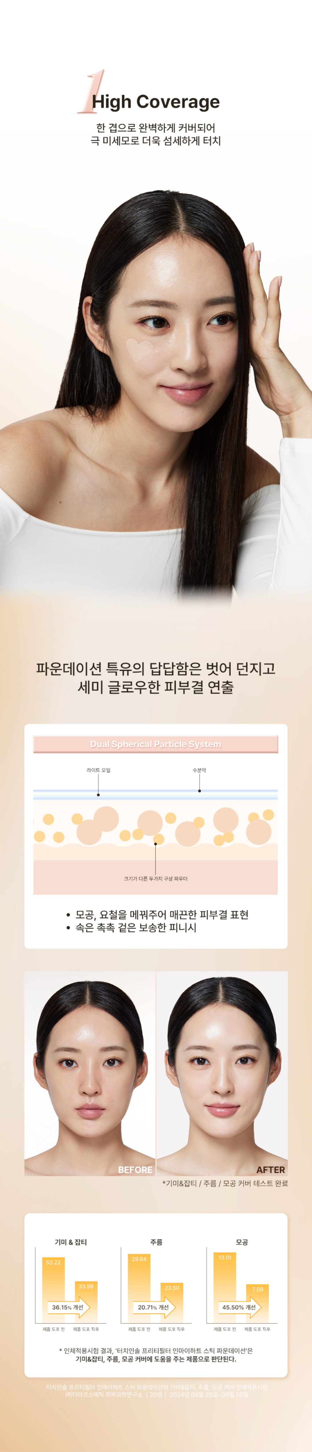 Human application test results confirm the effectiveness of TOUCH IN SOL Pretty Filter In My Heart Stick Foundation in covering spots & blemishes, wrinkles, and pores.