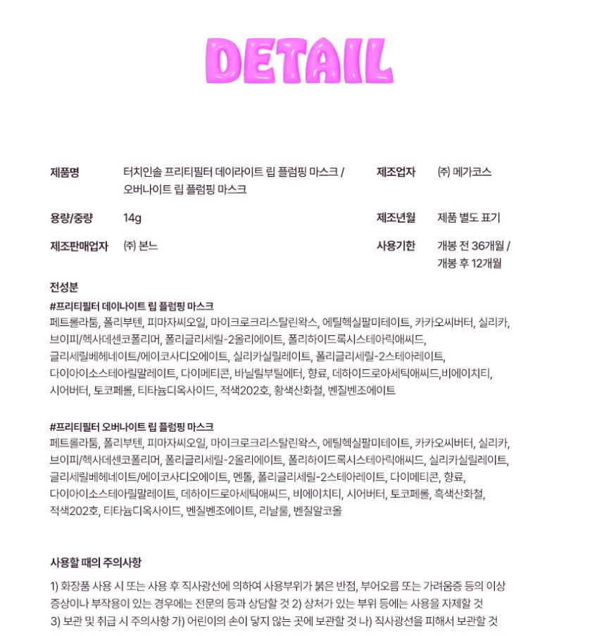 | Product Name | TOUCH IN SOL Pretty Filter Dailylight Lip Plumping Mask / Overnight Lip Plumping Mask |