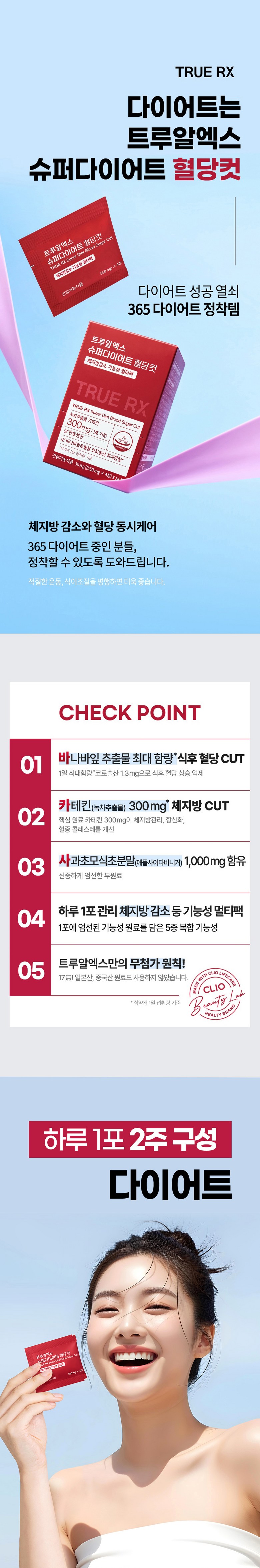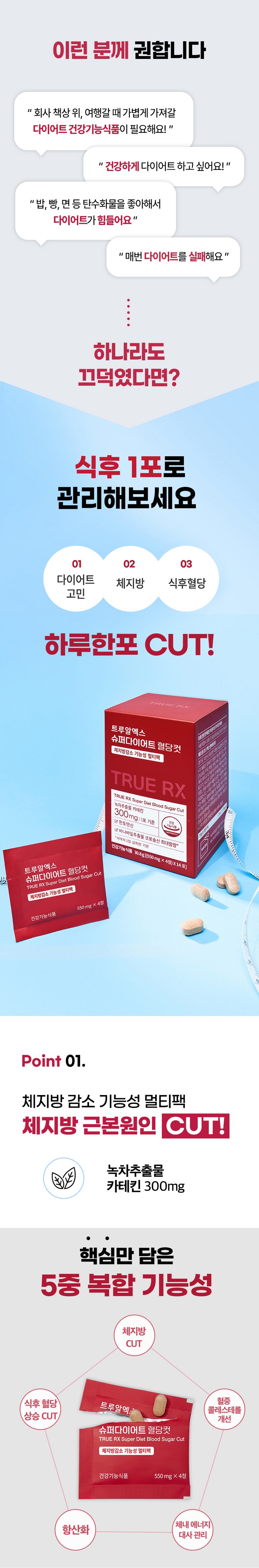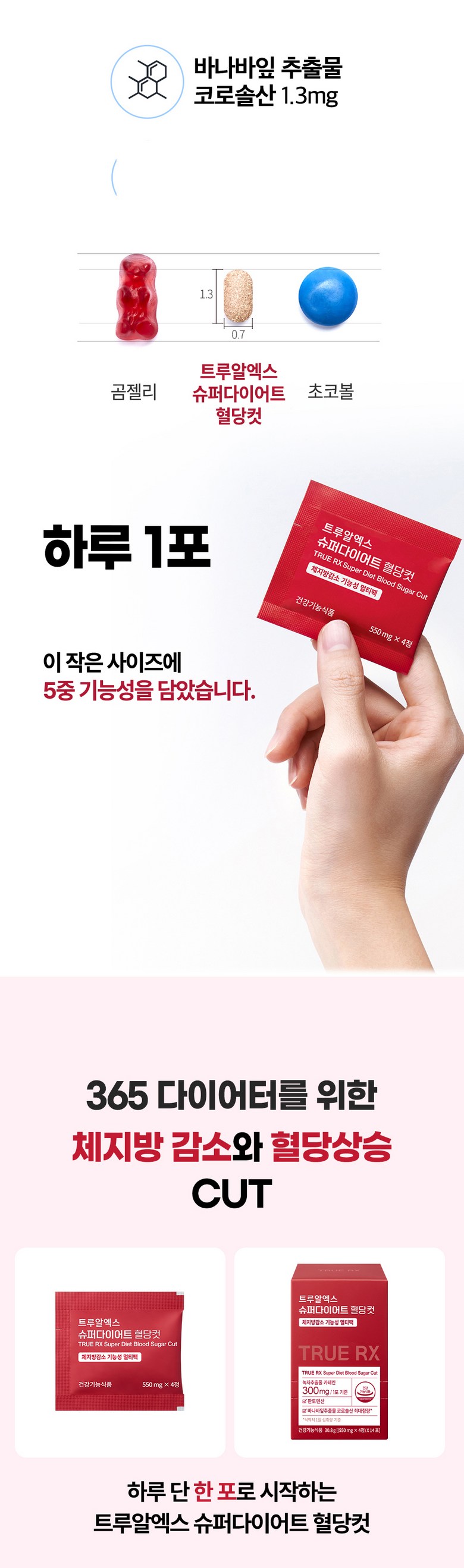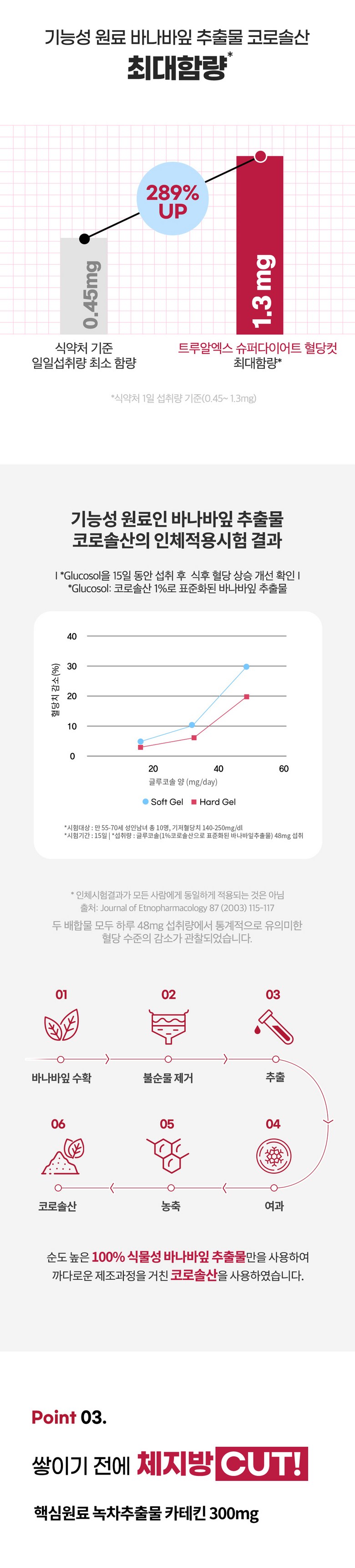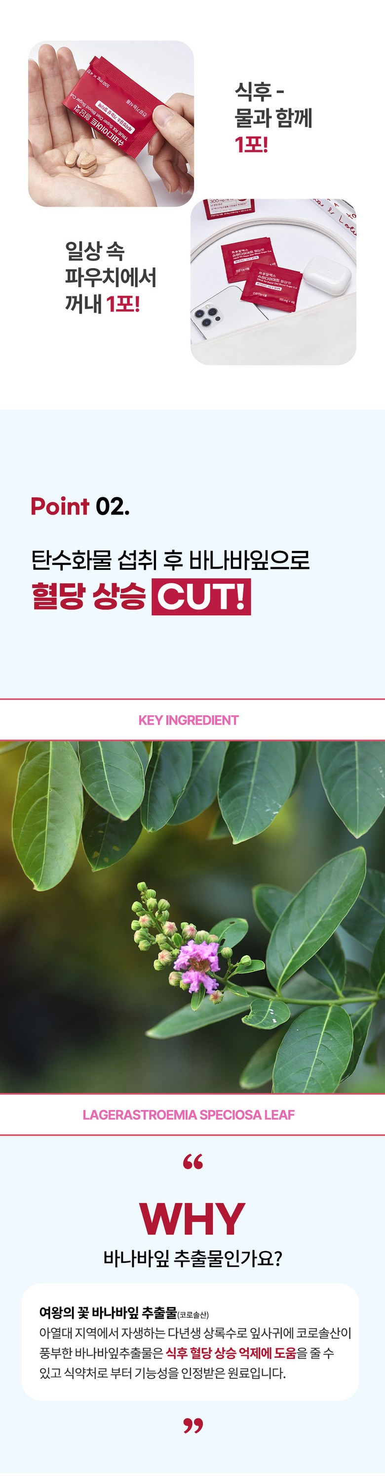 | 01 | Post-Meal Blood Sugar CUT | Contains the maximum daily intake of Banaba Leaf Extract (1.3mg Corosolic Acid) to effectively suppress post-meal blood sugar rise after carbohydrate intake. |