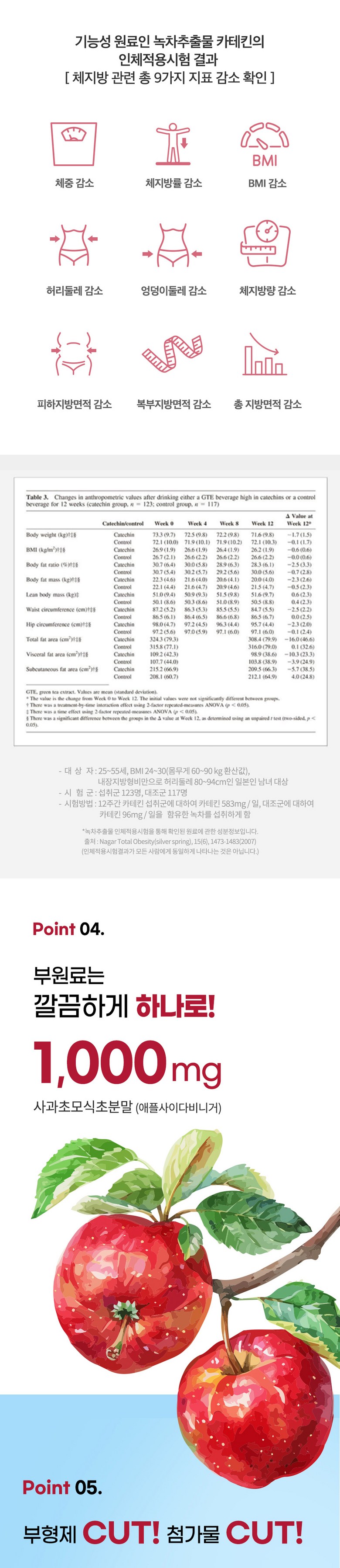 | 02 | Body Fat CUT & Cholesterol Improvement | Formulated with Green Tea Extract (Catechin 300mg) which helps reduce body fat, provides powerful antioxidant benefits, and improves blood cholesterol levels. |