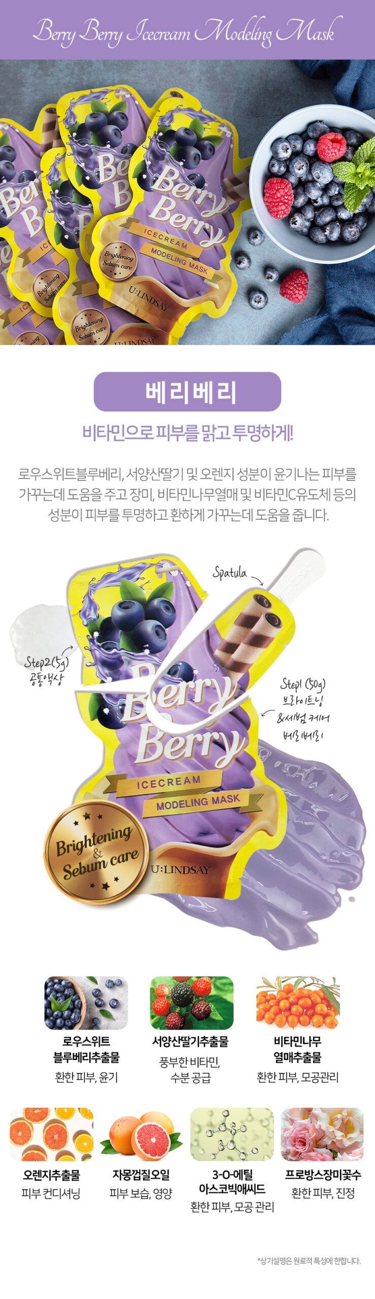 Ingredients such as raw sweet blueberry, wild strawberry, and orange help make your skin glowing, while ingredients such as rose, vitamin tree fruit, and vitamin C derivatives help make your skin transparent and bright.