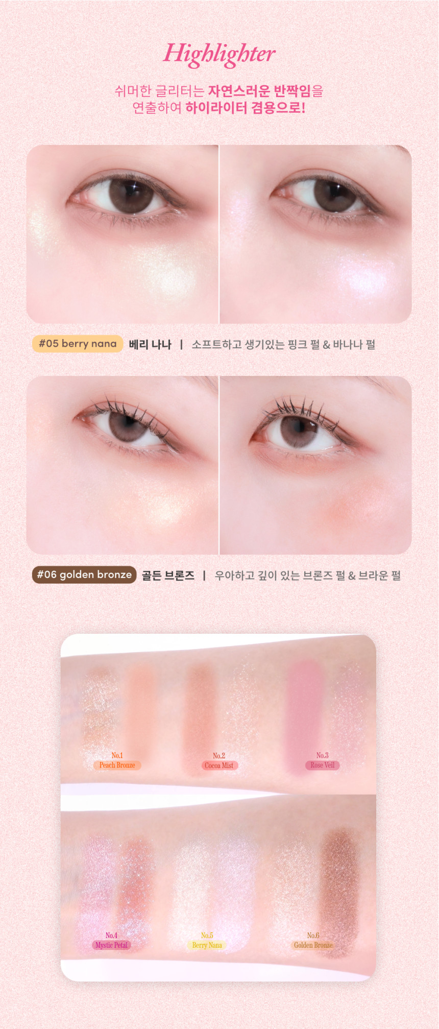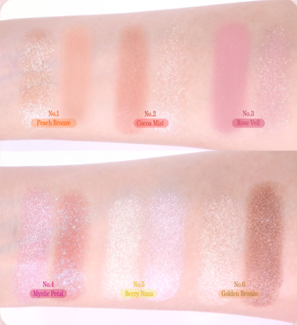 | Colors Available | 6 Shades (01 Peach Bronze, 02 Cocoa Mist, 03 Rose Veil, 04 Mystic Petal, 05 Berry Nana, 06 Golden Bronze) |