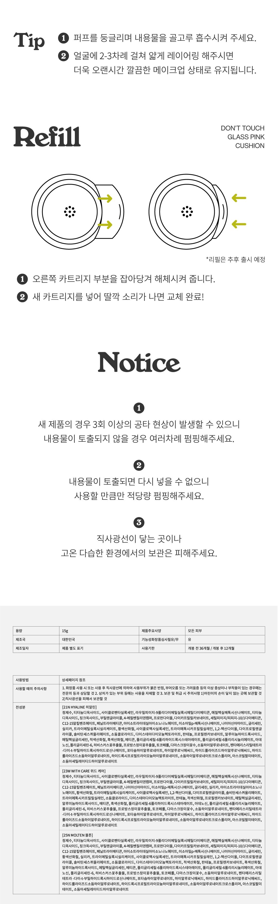 For a perfect glass skin finish, gently press the included puff into the cushion to pick up product. Lightly pat onto your face, starting from the center and blending outwards. Build coverage as desired by layering thin coats. For an extra boost of radiance, focus on the high points of your face.