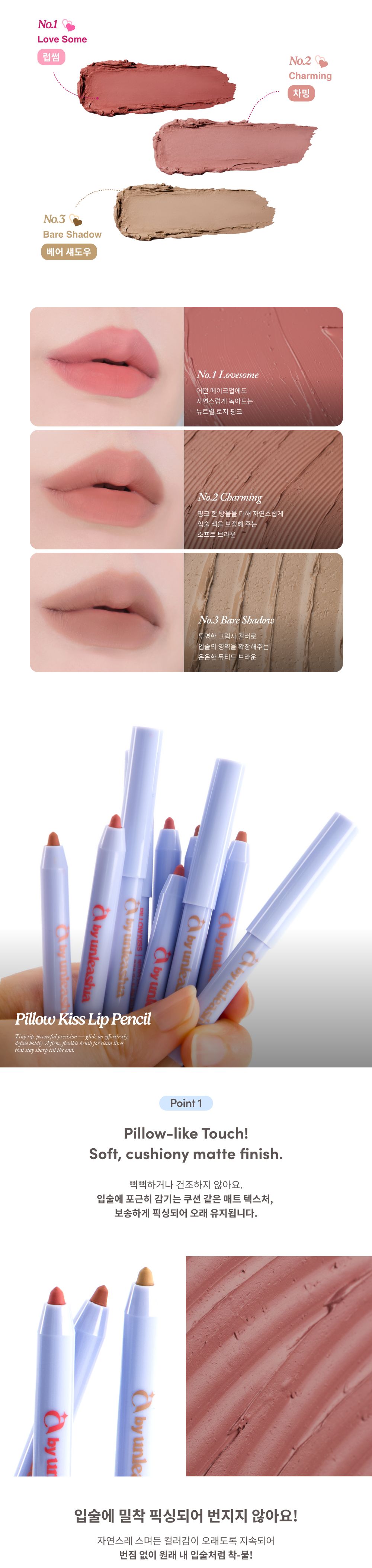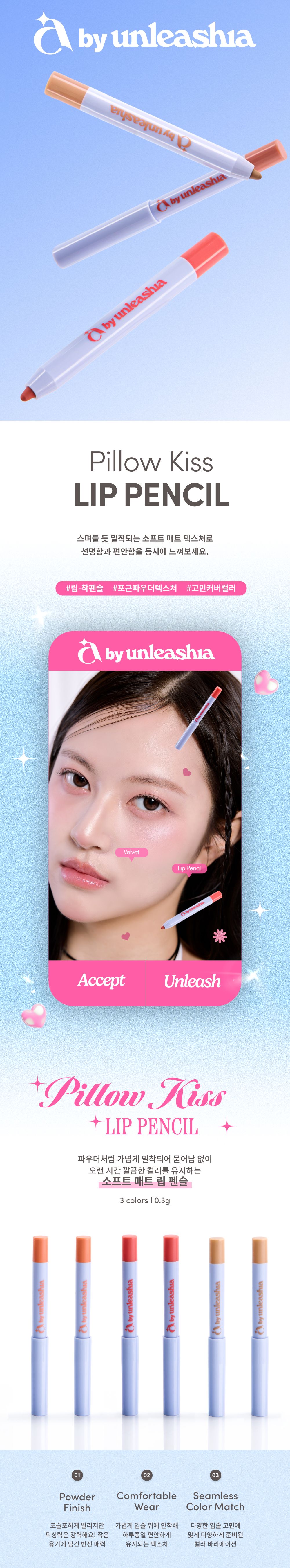 Experience the ultimate in lip definition and comfort with the UNLEASHIA Pillow Kiss Lip Pencil. This innovative product features a soft, matte texture that blends seamlessly, making it an essential addition to your makeup collection.