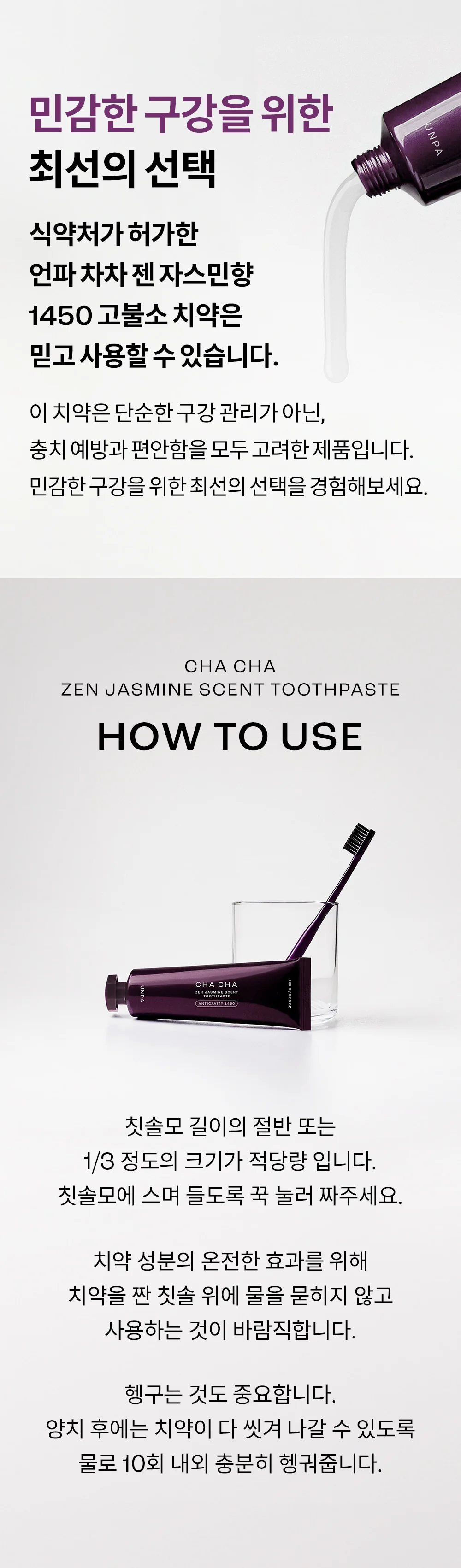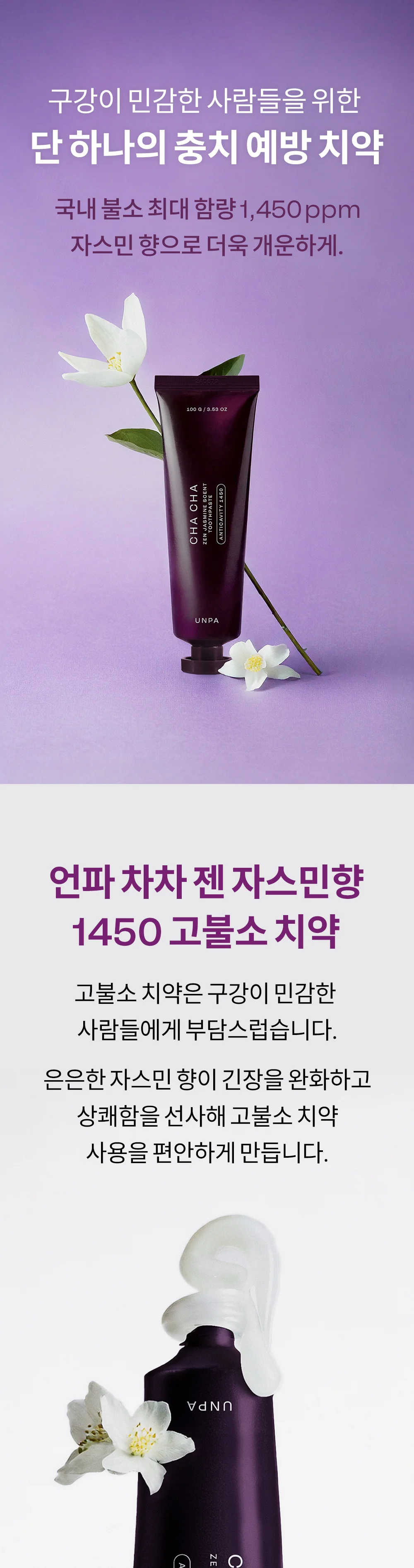 Introducing the UNPA Cha Cha Zen Jasmine Scent 1450 High Fluoride Toothpaste, featuring the highest fluoride content legally permissible in Korea at 1,450ppm. We understand that high-fluoride toothpastes can sometimes feel intense. That’s why our unique formulation integrates a delicate jasmine scent to ease tension and leave your mouth feeling incredibly fresh. This innovative approach makes powerful cavity prevention comfortable and enjoyable, even for those with sensitive oral conditions.