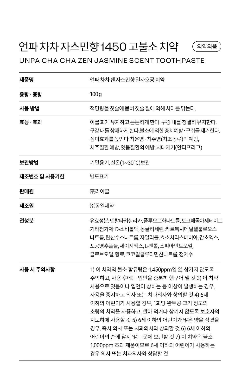 - Product Name: UNPA Cha Cha Zen Jasmine Scent 1450 High Fluoride Toothpaste