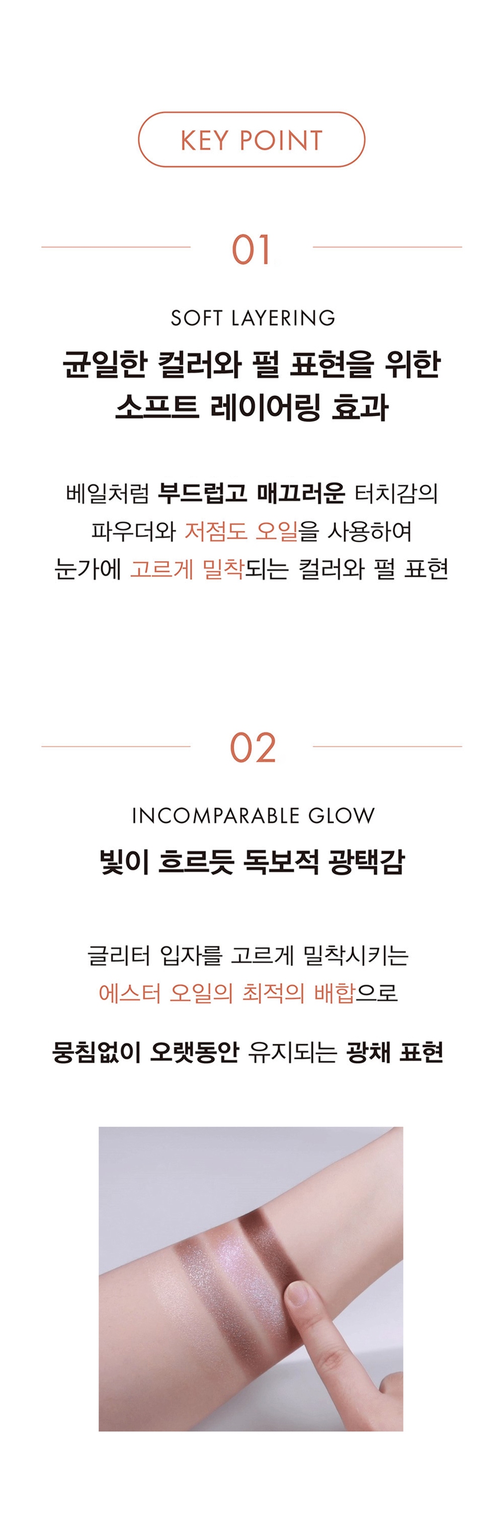 - Soft Layering : Creates a soft layering effect for even color and shimmer payoff. Formulated with silky-smooth powder and low-viscosity oils, it blends seamlessly onto the eye area for a smooth, evenly adhered finish.