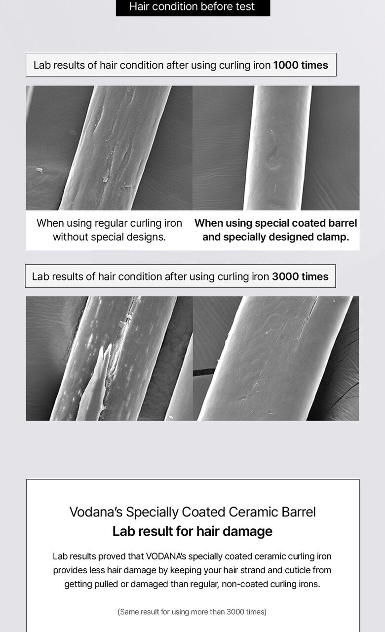 The VODANA Glam Wave Curling Iron is designed with exclusive ceramic coating technology, reducing hair damage such as tugging and cuticle splitting compared to curling irons without this feature.