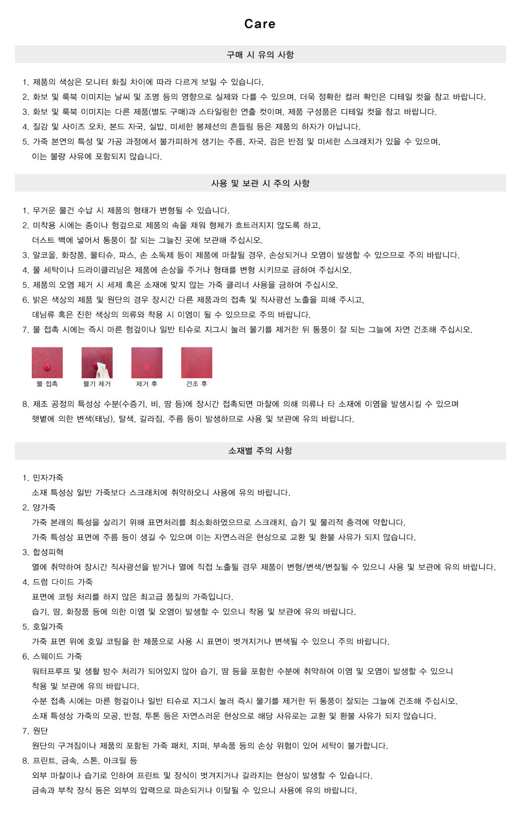 - In case of water contact, dry the product naturally in a ventilated area after gently removing moisture.