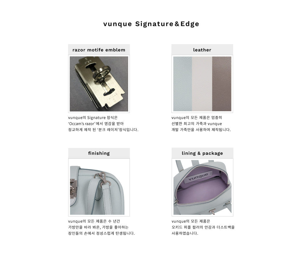 - Razor Motif Emblem: A highlight of the bag is the ‘Vunque Razor’ decoration, an exquisite emblem inspired by the principle of ‘Occam’s Razor’. This signature adornment adds a sophisticated touch to the bag’s aesthetic.
