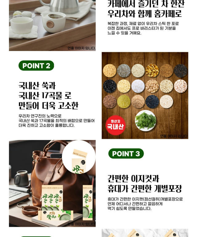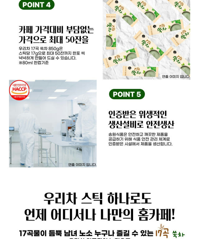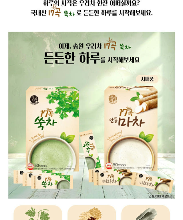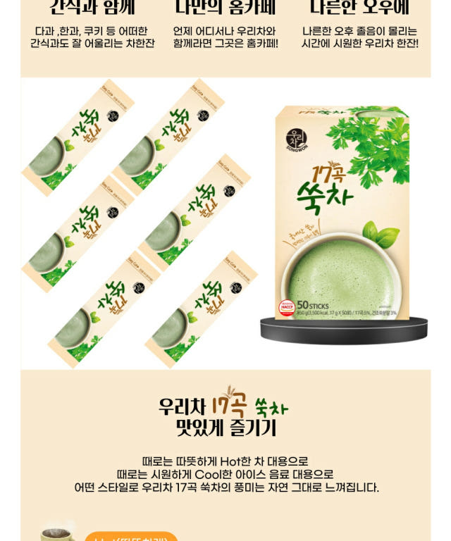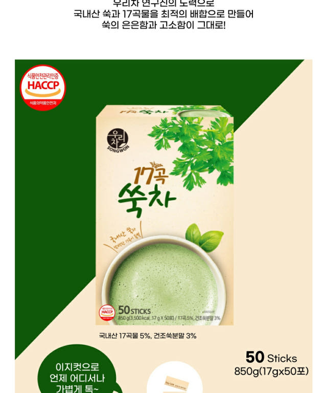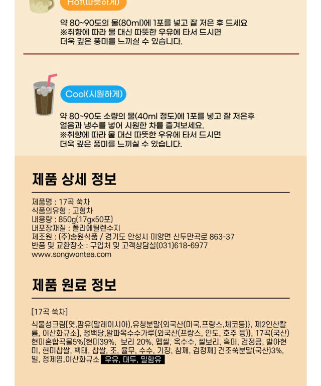 Creamer (Corn Syrup, Palm Oil (Malaysia), Whey Powder (Foreign: USA, France, Czech, etc.), Dipotassium Phosphate, Silicon Dioxide, Emulsifier, Alpha Corn Oil (Foreign: Australia, Brazil, Russia, etc.)), 17 Grains (Domestic) Brown Rice 5% (Brown Rice 39%, Barley 20%, Glutinous Rice, Corn, Pearl Barley, Black Rice, Black Soybean, Germinated Brown Rice, Glutinous Brown Rice, White Bean, Millet, Adlay, Sorghum, Foxtail Millet, Sesame, Black Sesame), Dried Mugwort Powder (Domestic) 3%, Wheat, Refined Salt, Silicon Dioxide.