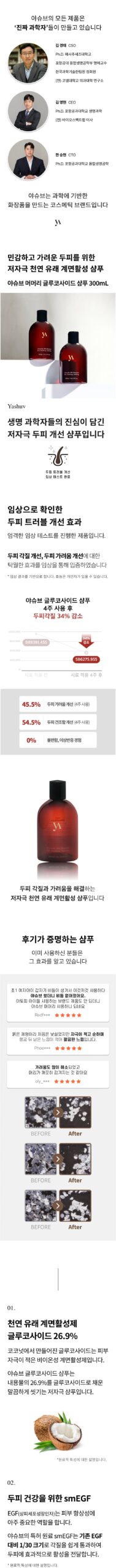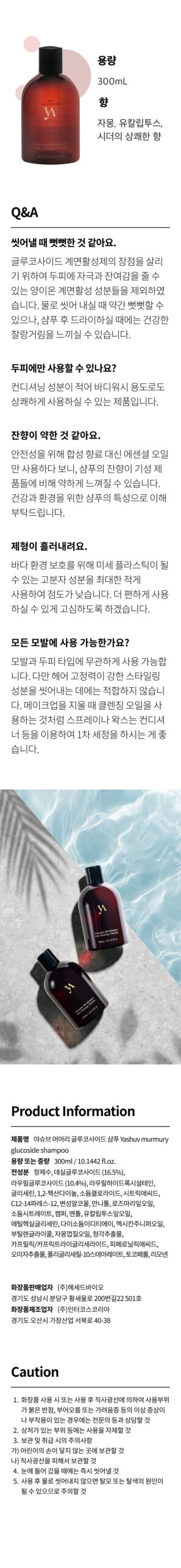 Yashuv uses a supercritical process to stabilize natural extracts such as ginseng and omija, which help soothe the scalp. The shampoo is also fragranced with essential oils from eucalyptus leaves, Mexican juniper (cedar), and grapefruit, avoiding the use of artificial fragrances.