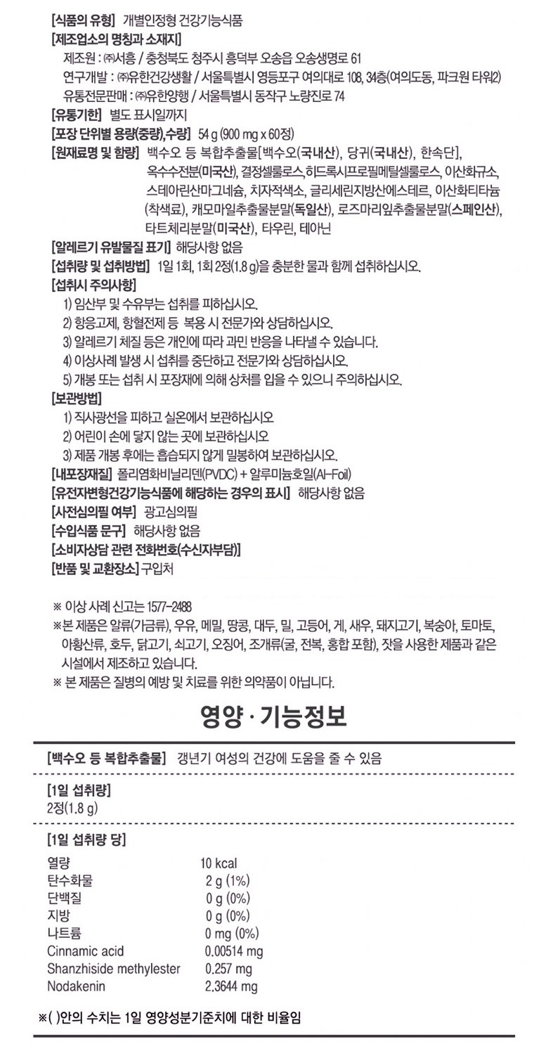 - Contains Baeksuoh, Danggui, and Hanbokdan complex extract