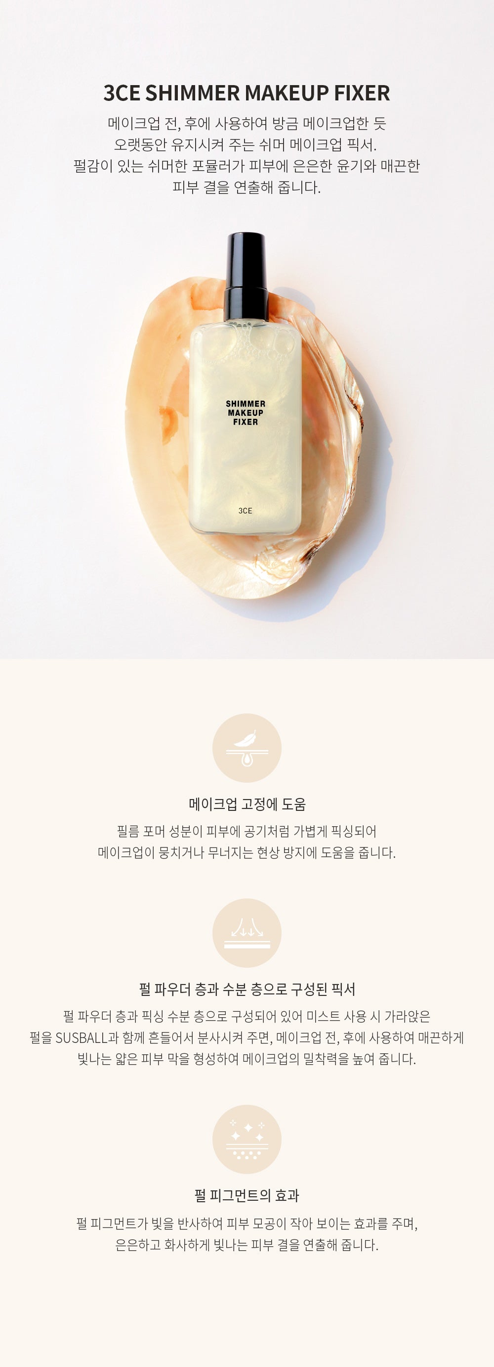Use the 3CE Shimmer Makeup Fixer to keep your makeup looking pristine and radiant all day long.