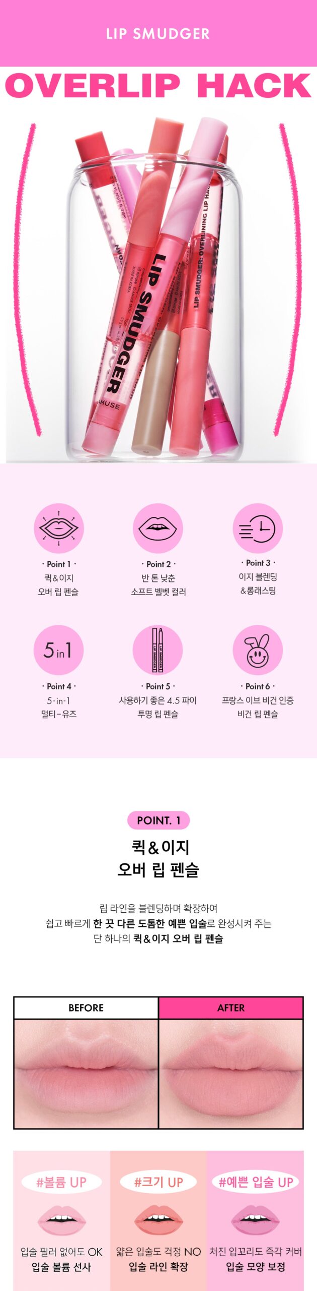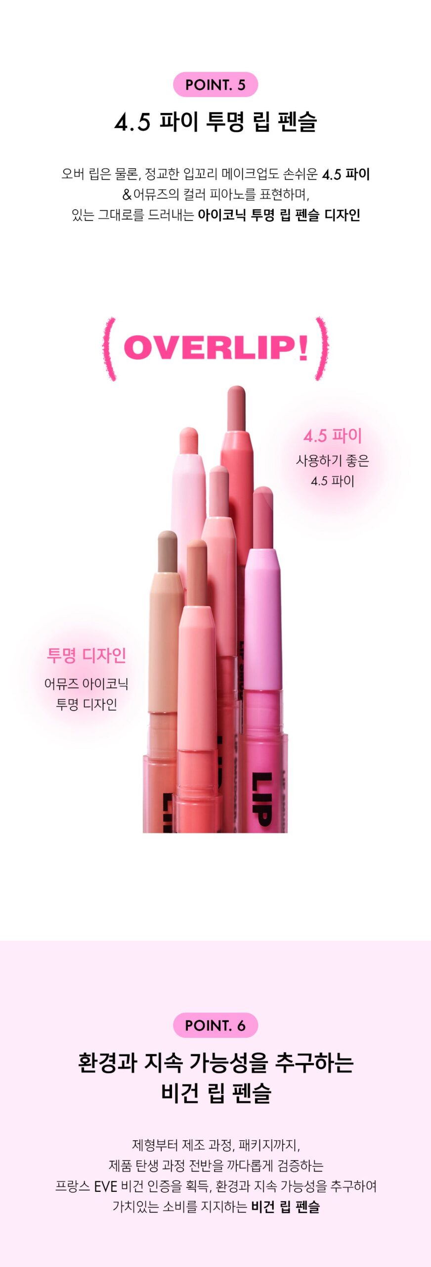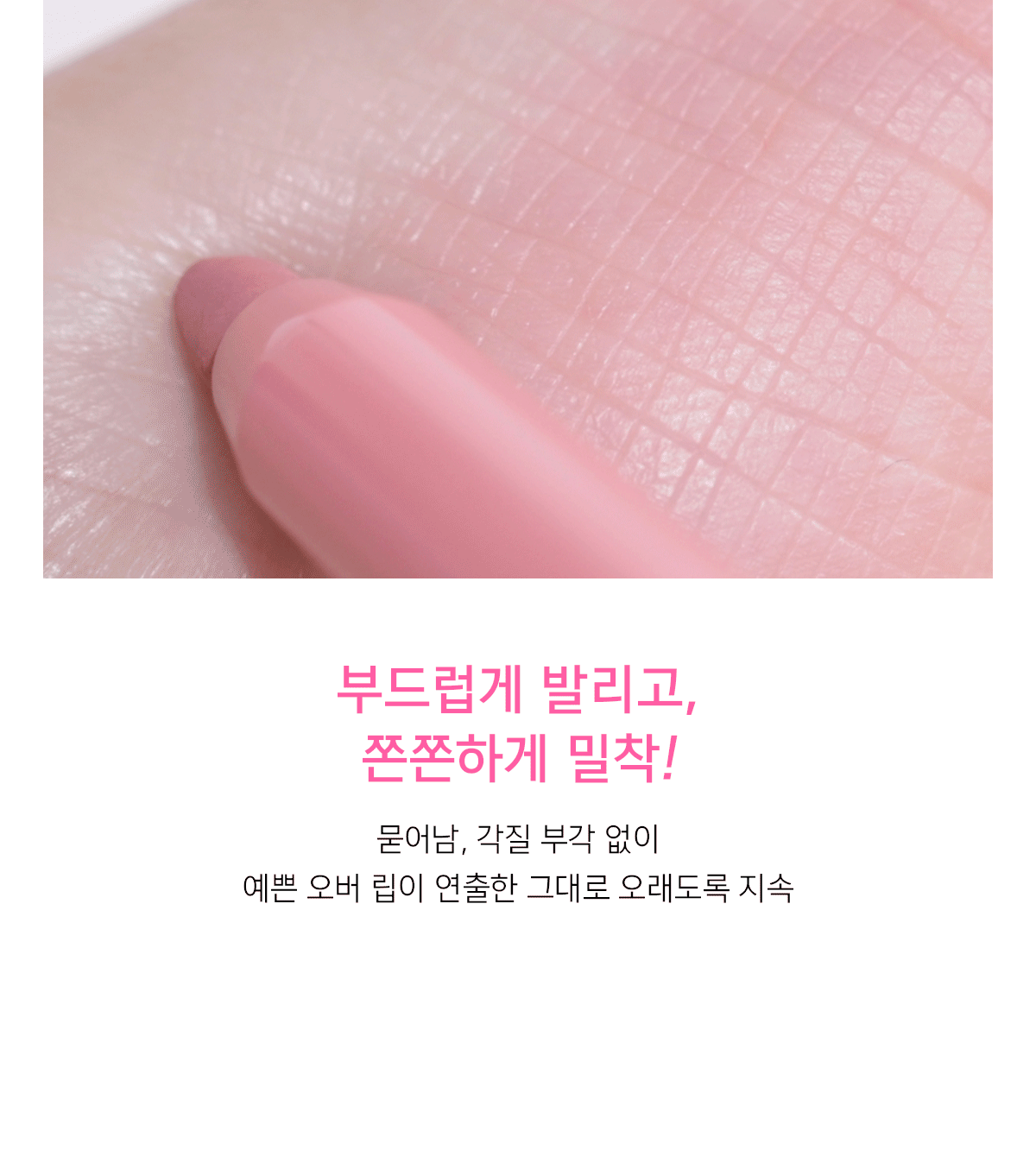 A long-lasting & smudging overlap lip pencil that applies smoothly and adheres tightly to overlips, natural shades, and even cheeks.