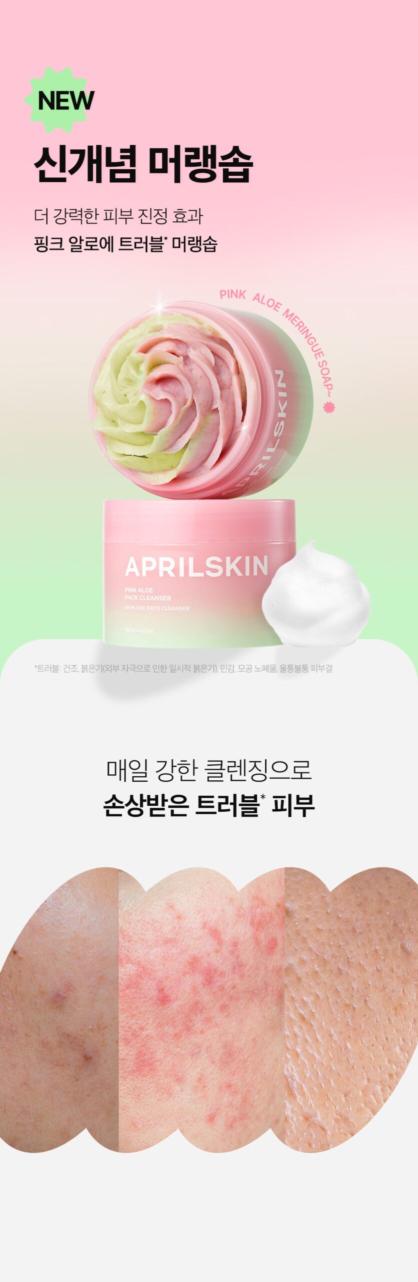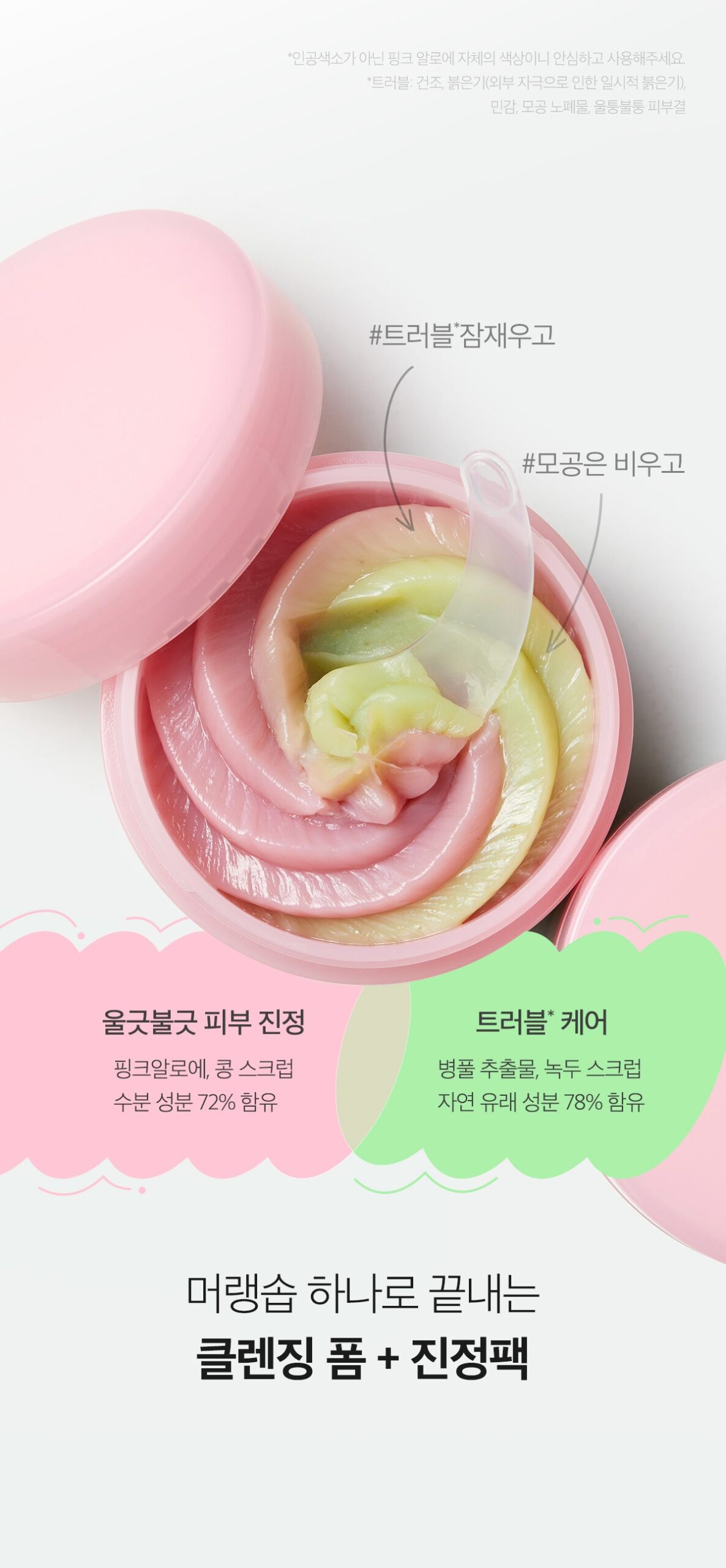 - Contains Pink Aloe, Centella Asiatica extract, mung bean and soy scrub, and other natural ingredients.