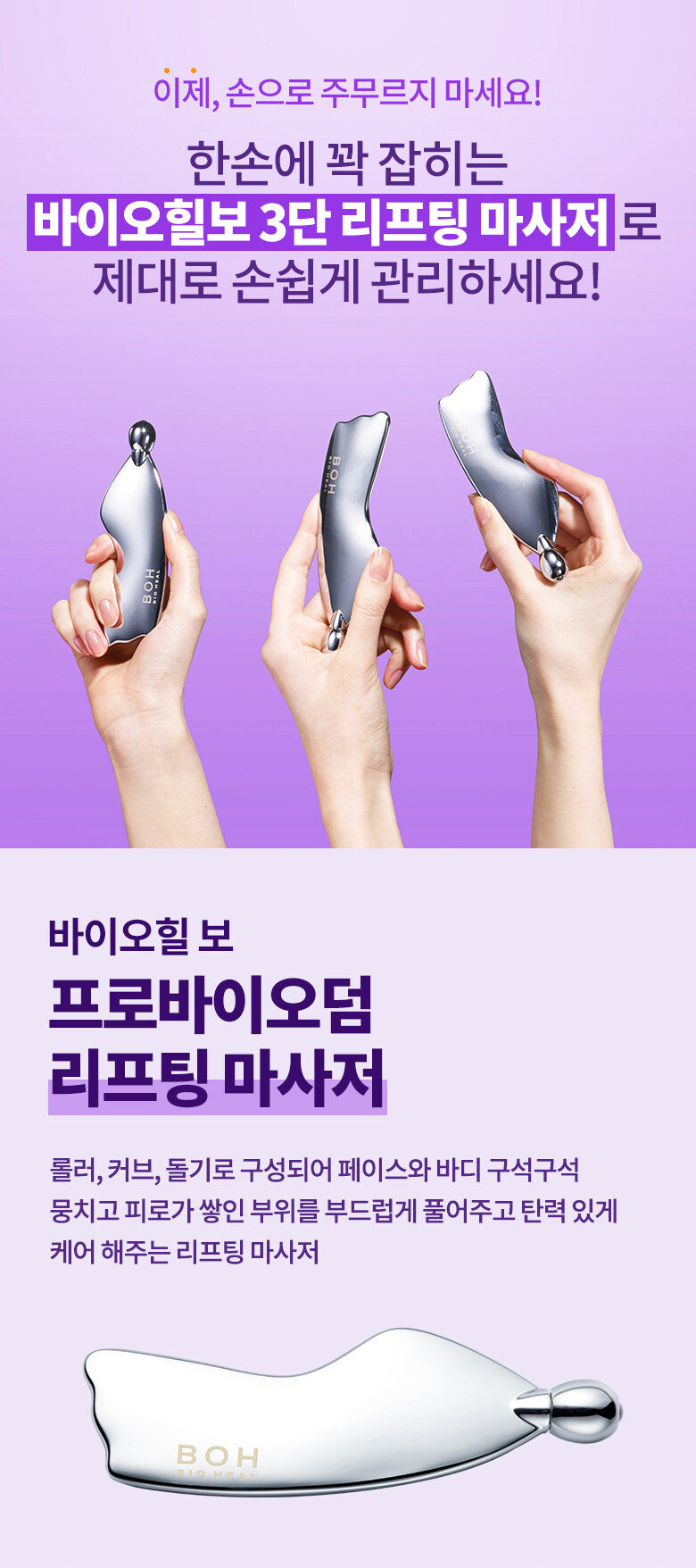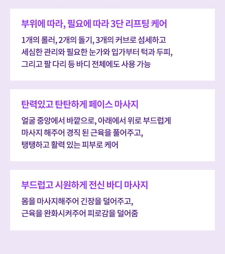 With 1 roller, 2 protrusions and 3 curves, it can be used on the entire body, from the eye area and mouth area to the chin and scalp, and arms and legs required for delicate and meticulous care.