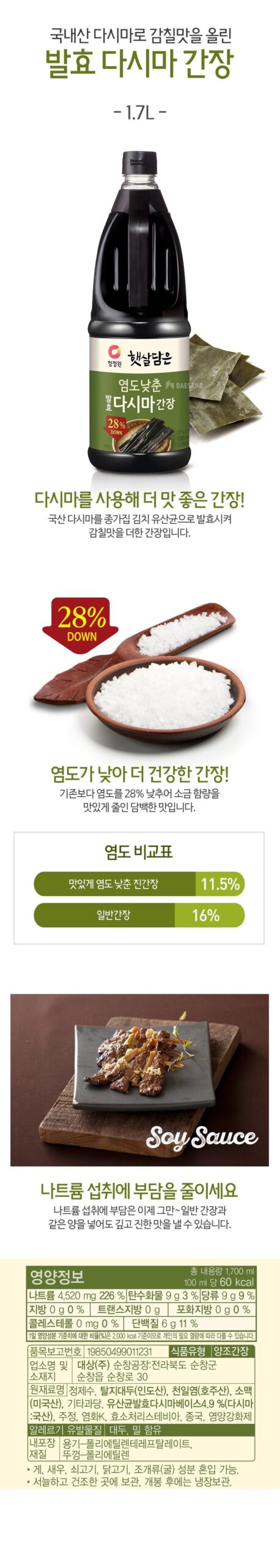 I’ve gotta say, this Chungjungwon soy sauce really blew me away! I’m usually skeptical about low-salt options—like, will it actually taste good? But man, it’s delicious! The savory flavor from the kelp is legit and adds a nice depth to my stir-frys. I used it in some dumplings last week; couldn’t tell there was any difference with regular soy sauce. Plus, the fact that there’s 28% less salt means I can use more without feeling guilty—my doctor would be proud! Definitely gonna keep this in my pantry now.