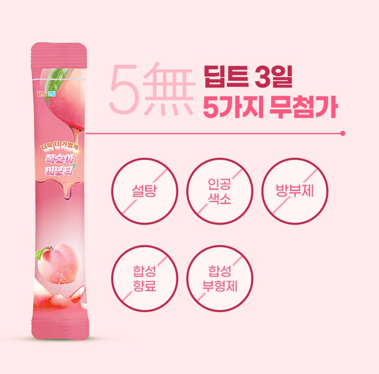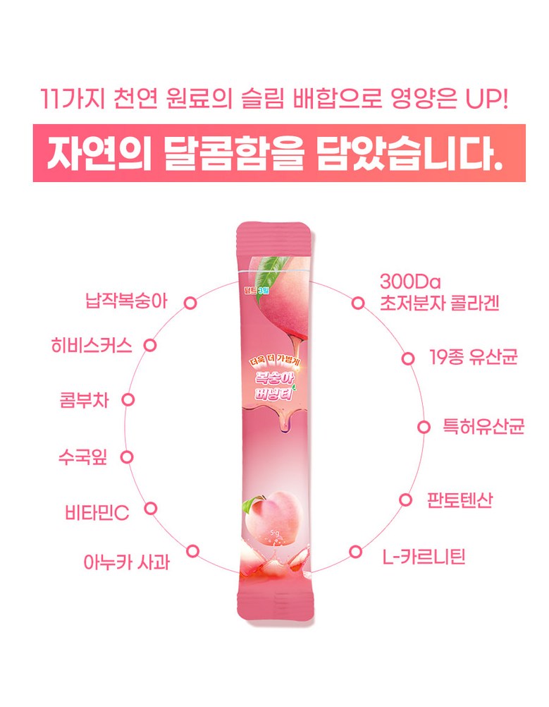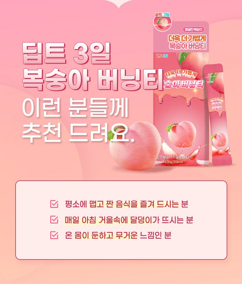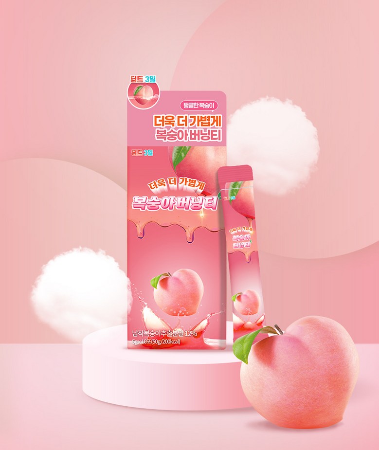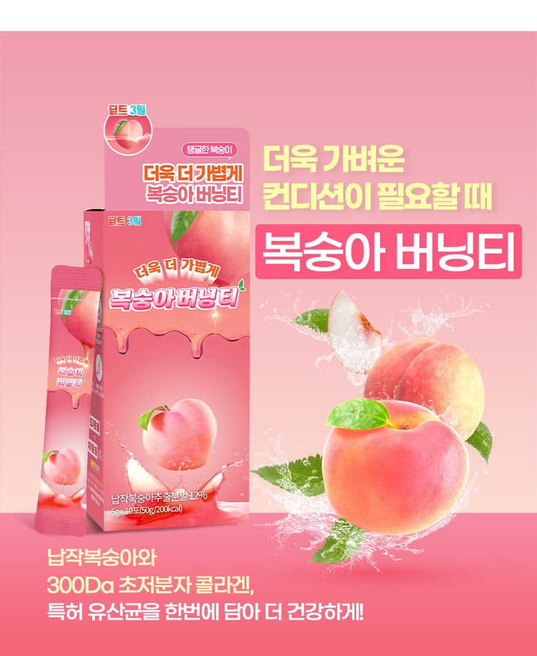 Deepte 3-Day Peach Burning Tea is a blend of carefully chosen ingredients, including flat peaches that have been thoroughly cleaned with high-pressure washing to remove any dirt and sand. The tea is enhanced with 300DA ultra-low molecular weight collagen and patented lactobacilli, providing a perfect balance of nourishment and natural sweetness. The slim formula combines 11 raw plant extracts, making it ideal for long-term consumption.