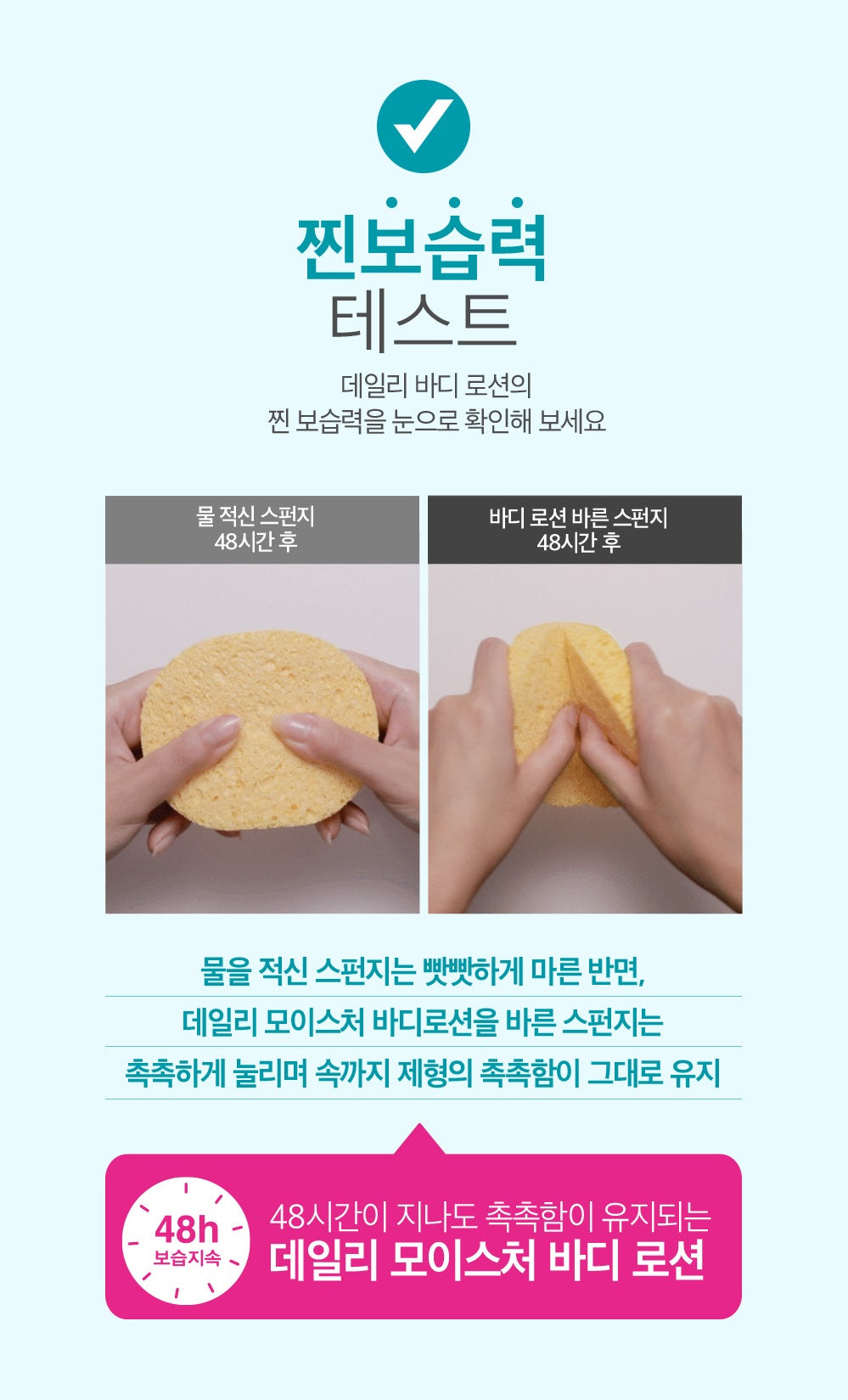 A sponge moistened with water is stiff and dry, while a sponge applied with Daily Moisture Body Lotion is pressed moistly and the moisture of the formula is maintained right down to the inside.