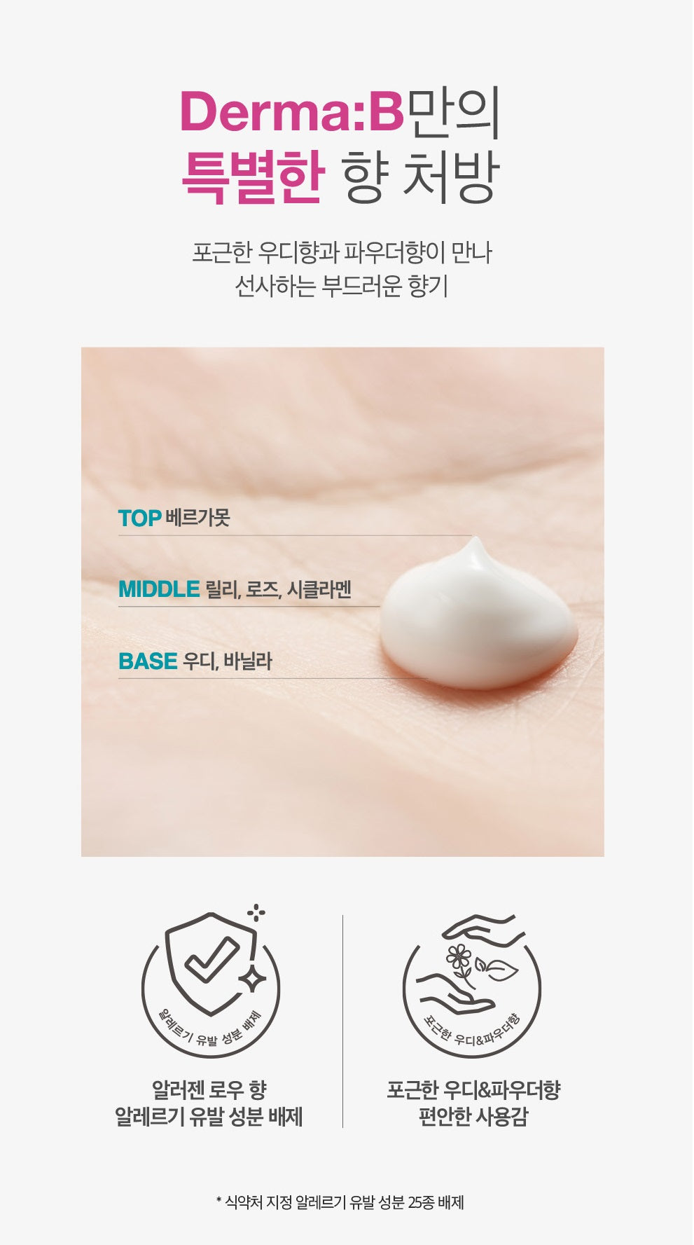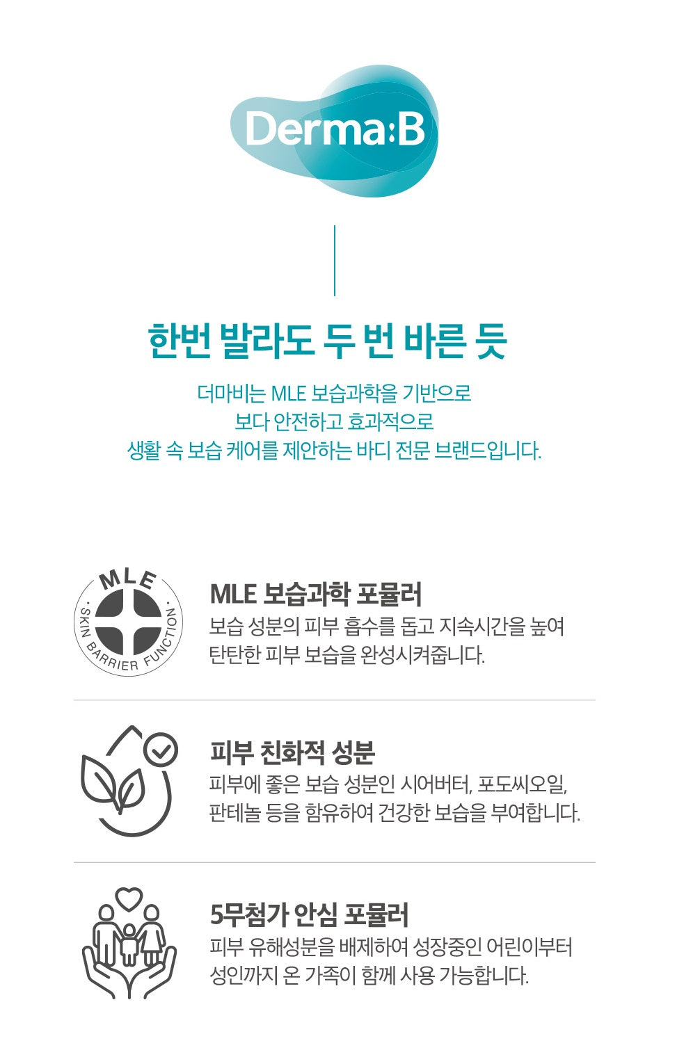 Derma:B is a body specialty brand that offers safer and more effective moisturizing care in daily life based on MLE moisturizing science.