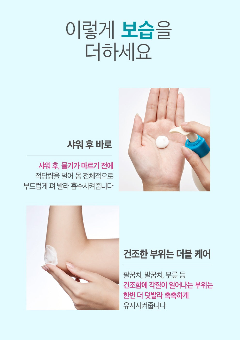 Re-apply to areas where dead skin cells occur due to dryness, such as elbows, heels, and knees, to keep them moist.