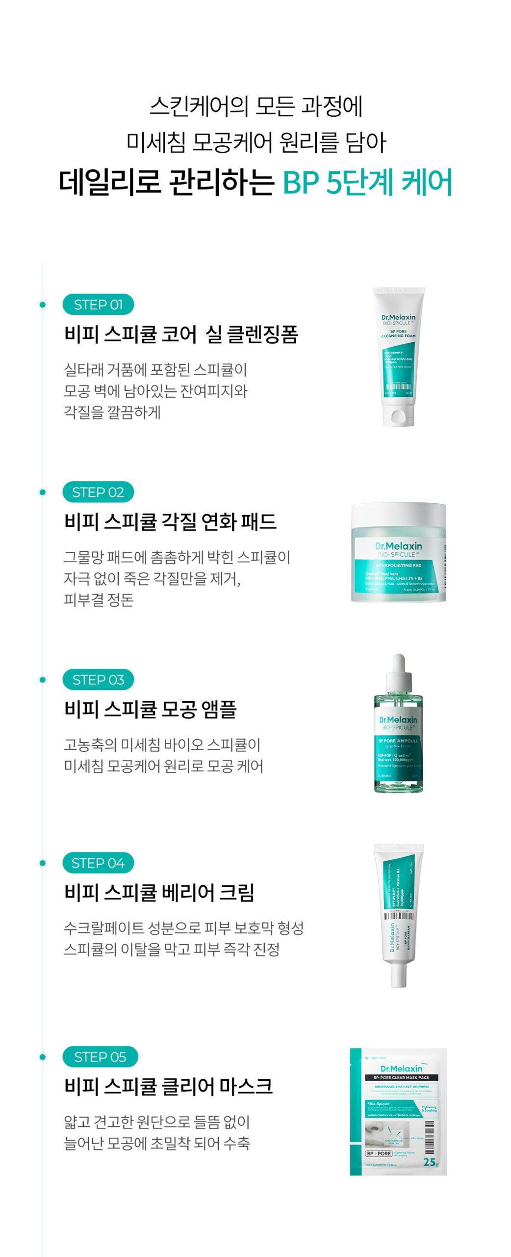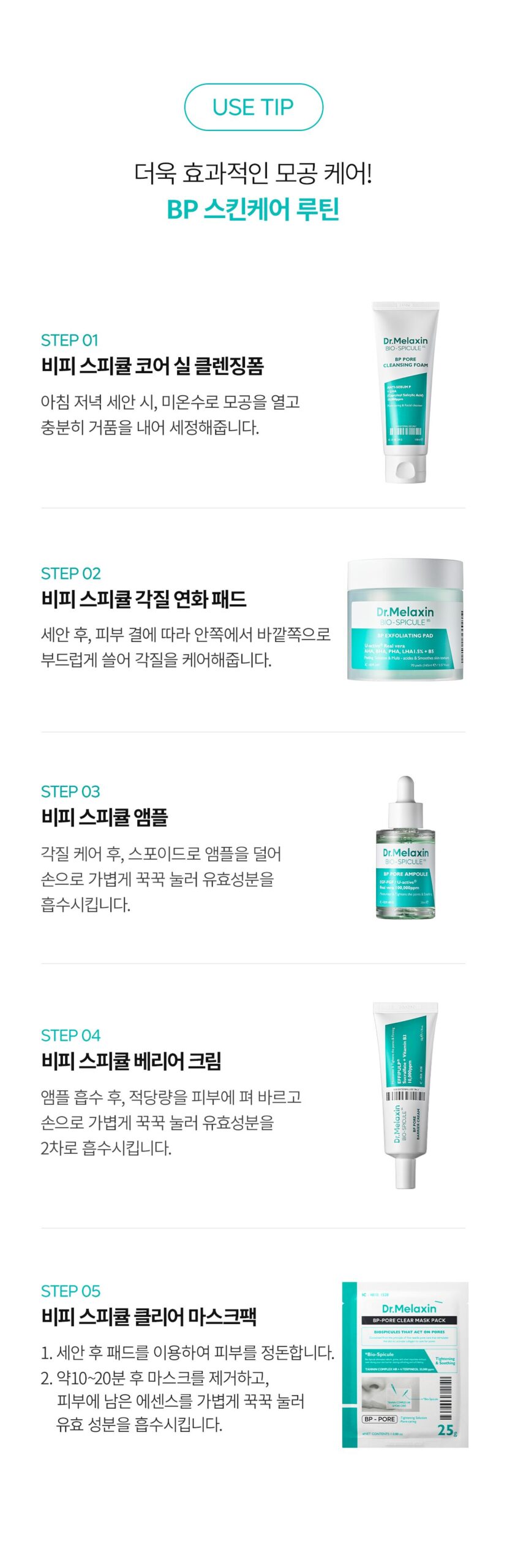 - STEP 05: Once or twice a week, finish with the BP Spicule Clear Mask for deep pore tightening and hydration.