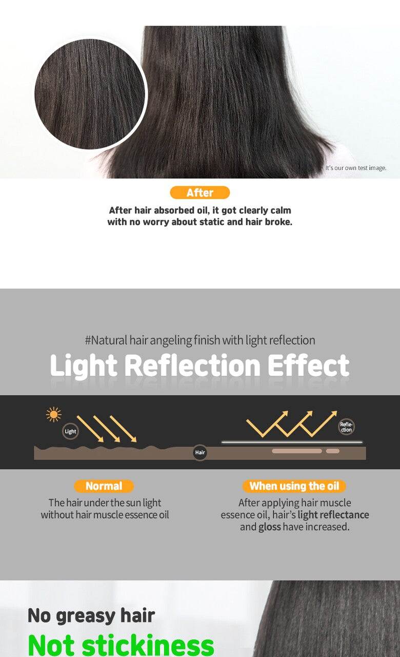 Elizavecca Hair Muscle Essence Oil CER-100 is designed to absorb and coat damaged and dry hair with plant-based oils, providing a moist, feather-like texture and a healthy, angelic gloss. The essence oil enhances hair’s light reflection and shine, ensuring your hair looks radiant and glossy.